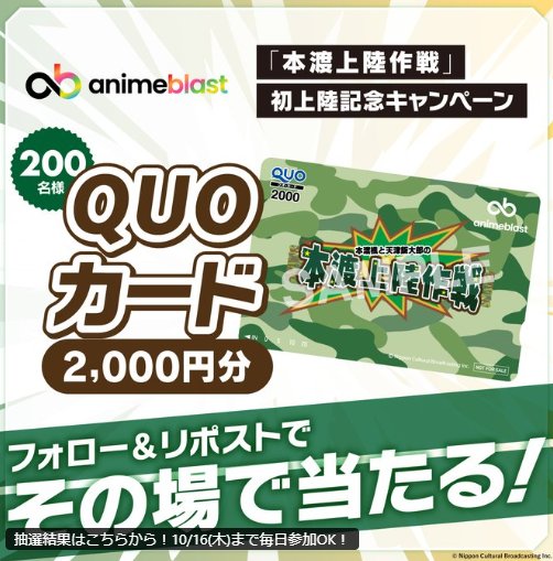 懸賞情報その場で当たる2,000円分のオリジナルQUOカードが当たる毎日応募Xキャンペーン 懸賞名:「本渡上陸作戦」 初上陸記念キャンペーン当選賞品:QUOカード 2,000円分当選人数:200名様応募条件:X(Twitter)アカウントで毎日その場で当たる企業名:anime blast この懸賞に応募する2025年10月16日(残り8日) 見逃せない懸賞後藤さんサイン入り前掛け +焼酎甲類1年分 / 焼酎甲類 1年分 他1名様 / 50名様 他ディズニーリゾート パークチケット / お菓子詰め合わせ2,500組5,000名様 / 45,000名様combi チャイルドシート / Amazonギフトカード 3万円分 / Apple Watch SE 他1名様 / 2名様 / 2名様 他サントリー DHA&EPA+セサミンEX1万名様えらべるPay 最大5,000円分毎月合計530名様オリジナル名入れ絵本ダウンロードデータ対象者全員 応募可能な懸賞関連する当選報告 【リテールパートナーズ マルキョウ×プリマハム】東京ディズニーランド ザ・ダイヤモンドホースシュー 貸切ご招待残り26日全プレもアリ☆ベビー用品や便利家電も当たる豪華キャンペーン!定期開催1万円分のスシロー食事券が当たる豪華X懸賞!不定期開催映画の試写会招待券が当たる会員限定キャンペーン!作品によって異なります【ママさん・妊婦さん限定】全プレもアリ☆豪華プレゼントキャンペーン♪毎月抽選豪華グルメが当たるトラストナビのプレゼントキャンペーン!定期開催 日本アクセスの懸賞で「どら焼き」が当選しました♪プロントのTwitter懸賞で「マ・マーあえるだけパスタソース&ステッカー」が当選しました!ぐるっぱ 「”K&K 缶つま”「 2缶セット」が当選しました♪リードオフジャパンのTwitter懸賞で「アップルタイザー クリスマス限定ボトルセット」が当選しました♪LION「キレイキレイ薬用キッチン泡ハンドソープ」が当選しました♪大塚製薬「ポカリスエット ゼリー6個」が当選しました! 関連情報: X懸賞(Twitter懸賞)オープン懸賞毎日応募ネット懸賞その場で当たる現金・金券・ギフト券SNS懸賞懸賞情報 QUOカード HOME懸賞情報応募方法SNS懸賞X懸賞(Twitter懸賞)2,000円分のオリジナルQUOカードが当たる毎日応募Xキャンペーン 2025年10月03日 更新:ものりんず@懸賞主婦【厳選】毎日応募 【全て】毎日応募