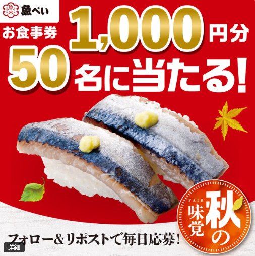 懸賞情報その場で当たる1,000円分の魚べい食事券がその場で当たるXキャンペーン 懸賞名:秋の味覚フェアキャンペーン当選賞品:魚べい食事券 1,000円分当選人数:50名様応募条件:X(Twitter)アカウントで毎日その場で当たる企業名:魚べい この懸賞に応募する(応募期間終了)2025年08月30日今すぐ応募可能な懸賞はコチラから 見逃せない懸賞電気圧力鍋 / T-fal マルチパン / 丸美屋商品セット毎週100名様 / 毎週200名様 / 10,000名様ユニバーサル・エクスプレス・パス毎日最大30組様Panasonic 電気圧力鍋 / Nintendo Switch / LOGOS ポップフルシェルター 他1名様 / 1名様 / 1名様 他USJ ハロウィーン初日貸切招待券 / スタジオ・パス4,750組12,000名様 / 1,000組2,000名様ONE BY KOSE シワ改善美容液サンプル10,000名様サイベックス ミオス ベビーカー / 洗えるベビー布団セット / パナソニック 電動自転車 他1名様 / 3名様 / 1名様 他 応募可能な懸賞関連する当選報告 Amazonギフトカード500円分がその場で200名様に当たるXキャンペーン残り2日HYPER ZONe WHITE SODAやBLACK PUNCHがその場で当たるクローズド懸賞2025年12月25日(毎月抽選)2,000円分のQUOカードPayが当たる、推し馬応援キャンペーン2026年03月25日(全22回開催)ディズニーシー・1デーパスポート&ユカタン・ベースキャンプ・グリル食事券も当たる豪華ハガキ懸賞残り31日レストランGranna食事券や中村屋菓子詰め合わせなども当たるクローズドキャンペーン2026年01月31日(全2回開催)休日にも使えるMNL CITY PACKがその場で当たるXキャンペーン(本日最終日!!) ウォーカープラス×Suntory「金麦 12缶セット」が当選しました!ヤマナカ×伊藤ハムのハガキ懸賞で「伊藤ハム商品詰め合わせ」が当選しました!コノミヤ・ヤマザキのハガキ懸賞で「お菓子詰め合わせ&グッズ」が当選しました!ポッカサッポロのネットクローズド懸賞で「じっくりコトコトスペシャルBOX」が当選しました☆シックのTwitter懸賞で「スキンケアセット+QUOカード」が当選しました♪P&G「myレシピ.com『BRAUN Oral-b モニタープレゼント』」 関連情報: X懸賞(Twitter懸賞)オープン懸賞毎日応募ネット懸賞その場で当たる現金・金券・ギフト券SNS懸賞懸賞情報 食事券・グルメ券 HOME懸賞情報応募方法SNS懸賞X懸賞(Twitter懸賞)1,000円分の魚べい食事券がその場で当たるXキャンペーン 2025年08月27日 更新:ものりんず@懸賞主婦【厳選】毎日応募 【全て】毎日応募