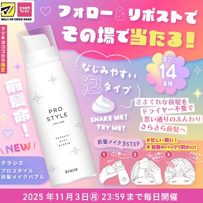 懸賞情報その場で当たるプロスタイル 前髪メイクバブルが14名様にその場で当たるXキャンペーン 懸賞名:フォロー&リポストで当たる当選賞品:プロスタイル 前髪メイクバブル当選人数:14名様応募条件:X(Twitter)アカウントで毎日その場で当たる企業名:マツキヨココカラ この懸賞に応募する2025年11月03日(残り13日) 見逃せない懸賞えらべるPay 1,000円分1,000名様AKB48サイン入りチェキ / AKB48アクスタ / QUOカードPay 1,000円分 他48名様 / 400名様 / 200名様 他無料で試せる「ベビー用スキンケア」のお得情報♪セブンプレミアム ポテトチップス無料クーポン5,000名様PayPayポイント 1,000ポイント / QUOカード 2,000円分+カードケース / タンブラー12,500名様 / 3,500名様 / 1,400名様タカラcanチューハイ or タカラ 焼酎ハイボール毎月5名様 応募可能な懸賞関連する当選報告 毎月開催♪ジョンソン製品が当たるアンケートキャンペーン定期開催カタログギフトや小岩井お楽しみセットも当たるクローズドキャンペーン残り17日商品券5,000円分や図書カードが当たる、JTBパブリッシングのアンケート懸賞♪定期開催(毎年3月・6月・9月・12月末日締切)毎日1名様にAmazonギフト10,000円分が当たる豪華X懸賞(本日最終日!!)全プレ☆佃煮詰め合わせや図書カードももらえるお楽しみ券キャンペーン!締切日不明ネスカフェ ゴールドブレンドの飲み比べセットが当たるレシート懸賞2025年11月30日(全4回開催) バリアケアのTwitter懸賞で「バリアケアシリーズ全品」が当選しました!イオンクレジット「公共料金キャンペーン」マックスバリュ東海×おやつカンパニーのハガキ懸賞で「おやつタウンパスポート」が当選しました!Coca-Cola【発売前に緊急ミッション!『ジョージア ザ・プレミアム 微糖』が発売前に当たる!】キャンペーン伊藤園「NEW TEAs’TEA 第二弾先行体験セット」が当選しました♪コノミヤ×伊藤ハムのハガキ懸賞で「伊藤ハム商品詰め合わせ」が当選しました! 関連情報: X懸賞(Twitter懸賞)オープン懸賞毎日応募ネット懸賞その場で当たるSNS懸賞美容・健康・コスメ懸賞情報 マツキヨココカラヘアケア・ヘアカラー HOME懸賞情報応募方法SNS懸賞X懸賞(Twitter懸賞)プロスタイル 前髪メイクバブルが14名様にその場で当たるXキャンペーン 2025年10月21日 更新:ものりんず@懸賞主婦【厳選】毎日応募 【全て】毎日応募