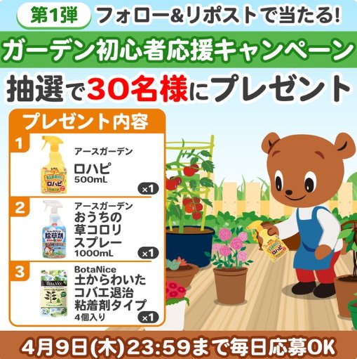 懸賞情報その場で当たるアース製薬のガーデン初心者セットがその場で当たるXキャンペーン 懸賞名:フォロー&リポストでその場で当たる当選賞品:ガーデン初心者セット当選人数:30名様応募条件:X(Twitter)アカウントで毎日その場で当たる企業名:アース製薬 この懸賞に応募する2026年04月09日(残り5日) 見逃せない懸賞EDWIN 特製ブルーGジャン / デニムバッグ / デニムコースター+一番搾り 糖質ゼロ100名様 / 500名様 / 1,000名様あなただけのグリーンラベル オリジナル缶5,000名様ロボット掃除機 / ミラーレス一眼カメラ / ホームベーカリー / リフトロジー 他5名様 / 5名様 / 15名様 / 15名様 他グーン製品 無料サンプル毎月6,000名様ヘナカラートリートメント無料サンプル応募者全員月刊ポピーの無料おためし見本応募者全員 応募可能な懸賞関連する当選報告 3,000円相当のPayPayポイントが当たるLINEクイズキャンペーン残り26日アラジン グラファイトトースターやル・クルーゼ商品も当たる豪華キャンペーン残り62日70種類の賞品から選べるクリアアサヒの豪華ポイントキャンペーン!定期開催山形県の特産品が当たる豪華プレゼントキャンペーン!定期開催JAタウンギフトカードやJA全農おすすめ商品などが当たるキャンペーン毎週開催北海道 音更町の特産品ギフトなどが当たる岩塚製菓のクローズドキャンペーン残り267日 Nintendo Switch Liteがヤクルト×ナフコトミダのキャンペーンで当選しました!カゴメのクローズド懸賞で「八女 極早生みかん 4kg」が当選しました!過去最高額「100万円分のAmazonギフト券」がIG証券の懸賞で当選!!イオン×コカ・コーラのクローズド懸賞で「コールマン 家中キャンプセット」が当選しました!「三井ガーデンホテルズ 無料宿泊券」当選&懸賞に当選するコツの基本♪Coca-Cola【発売前に緊急ミッション!『ジョージア ザ・プレミアム 微糖』が発売前に当たる!】キャンペーン 関連情報: X懸賞(Twitter懸賞)オープン懸賞毎日応募その場で当たるネット懸賞SNS懸賞懸賞情報その他 詰め合わせ・セット花・種・ガーデニング用品アース製薬 HOME懸賞情報応募方法SNS懸賞X懸賞(Twitter懸賞)アース製薬のガーデン初心者セットがその場で当たるXキャンペーン 2026年04月01日 更新:ものりんず@懸賞主婦【厳選】毎日応募 【全て】毎日応募