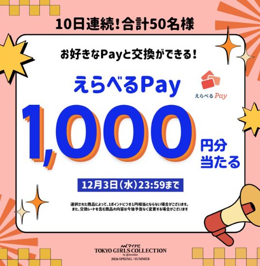 懸賞情報えらべるPay1,000円分が当たる毎日応募Xキャンペーン 懸賞名:マイナビ TGC 2026 S/S 毎日当たる キャンペーン当選賞品:えらべるPay 1,000円分当選人数:毎日5名様応募条件:X(Twitter)アカウントで毎日応募企業名:東京ガールズコレクション この懸賞に応募する2025年12月12日(残り1日) 見逃せない懸賞きのこ組キーホルダーセット3,000名様ヤーマンの美容家電セット / デジタル買い物券 200円分1名様 / 3,000名様無料で試せる「ベビー用スキンケア」のお得情報♪向井康二オリジナルクリアファイル / リカバリーウェア 他1,000名様 / 10名様 他JTBトラベルギフト 10万円分 / ビスケット詰め合わせ28名様 / 2,280名様カウネット オリジナル商品毎月50名様 応募可能な懸賞関連する当選報告 NHK交響楽団アンサンブルコンサートの無料招待券が当たるキャンペーン残り3日アップリカのベビーカーがお試しできるInstagramモニター募集キャンペーン残り6日JCB商品券10万円分やQUOカード5,000円分が当たるリサイクル懸賞残り15日オリジナルまけんグッズが当たるハガキキャンペーン残り110日毎週開催!もち吉の会員限定プレゼントキャンペーン残り6日バルミューダや加湿空気清浄機が当たるママさん向けアンケート懸賞♪毎月抽選 コノミヤのクローズド懸賞で「お楽しみセット」が当選しました!KAGOME「カゴメ夏のプレミアム 先行体験キャンペーン」に当選しました♪フィール×サッポロのキャンペーンで「ヱビス4種の味わいセット」が当選しました!平和堂×伊藤ハムのハガキ懸賞で「USJ 1デイ・スタジオ・パス」が当選しました!ヤクルトのハガキ懸賞で「オリジナルピクニックセット」が当選しました☆Suntory「トクホ ボスグリーン 6缶」が当選しました♪ 関連情報: X懸賞(Twitter懸賞)オープン懸賞毎日応募ネット懸賞現金・金券・ギフト券SNS懸賞懸賞情報 電子マネー・ポイント HOME懸賞情報応募方法SNS懸賞X懸賞(Twitter懸賞)えらべるPay1,000円分が当たる毎日応募Xキャンペーン 2025年12月03日 更新:ものりんず@懸賞主婦【厳選】毎日応募 【全て】毎日応募 クリスマス懸賞 年末年始懸賞