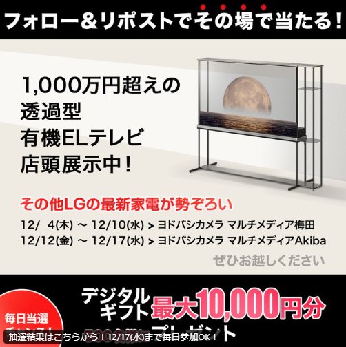 懸賞情報その場で当たる最大10,000円分のデジタルギフトが500名様にその場で当たるXキャンペーン 懸賞名:透明なテレビ 店頭展示記念キャンペーン当選賞品:デジタルギフト 最大10,000円分当選人数:500名様応募条件:X(Twitter)アカウントで毎日その場で当たる企業名:LGエレクトロニクス・ジャパン この懸賞に応募する(応募期間終了)2025年12月17日今すぐ応募可能な懸賞はコチラから 見逃せない懸賞ブタメンオリジナル電気ケトル毎月100名様テンスター カラーシャンプー無料サンプル対象者全員妊婦さん必見!無料で試せる「紙おむつ・粉ミルク」のお得情報 BEST10♪敏感肌用オールインワンジェル お試し無料モニター応募者全員PayPayポイント 最大400円分1,960名様幼児、小・中・高校生向け通信教育「スマイルゼミ」無料資料希望者全員 応募可能な懸賞関連する当選報告 カナダ6泊8日の旅や森保監督直筆サイン入りユニフォームなどが当たるキャンペーン残り14日サントリー商品や観戦チケットなどが当たる会員限定ポイントキャンペーン2026年06月30日(全3回開催)アニメ「ぼっち・ざ・ろっく!」のオリジナルグッズが当たる日清のレシート懸賞残り16日ユニバーサル・エクスプレス・パスが当たる三井住友カード利用キャンペーン残り45日カロリーメイト無料クーポンが必ずもらえるクイズキャンペーン残り2日最大1万円相当のガシャポンオンラインショップで使えるクーポンが当たるLINE懸賞締切日不明 集英社「BAILA ○○が嫌な口ぐせ集アンケート」日清のクローズド懸賞で「高級たまご+日清まぜ麺亭セット」が当選しました!KIRIN「午後の紅茶 おいしい無糖」が当選しました!資生堂「TSUBAKI 無料サンプル」が当選しました!興和「コーワのケロコロランド プレゼントキャンペーン」マックスバリュ東海×森永製菓のハガキ懸賞で「木下大サーカス招待チケット」が当選しました♪ 関連情報: X懸賞(Twitter懸賞)オープン懸賞毎日応募ネット懸賞その場で当たる豪華・高額懸賞現金・金券・ギフト券SNS懸賞懸賞情報 高額賞品・高級品ギフトコード|デジタルギフト HOME懸賞情報応募方法SNS懸賞X懸賞(Twitter懸賞)最大10,000円分のデジタルギフトが500名様にその場で当たるXキャンペーン 2025年12月01日 更新:ものりんず@懸賞主婦【厳選】毎日応募 【全て】毎日応募 年末年始懸賞
