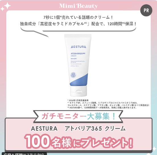 懸賞情報商品モニターAESTURA アトバリア365 クリームがお試しできるガチモニターキャンペーン キャンペーン名:「AESTURA アトバリア365 クリーム」のモニター企画に参加してくれる人募集!当選賞品:AESTURA アトバリア365 クリーム商品モニター当選人数:100名様応募条件:会員登録して応募企業名:トレンダーズコメント:※公開のX(旧Twitter)またはInstagramアカウントをお持ちの方 など条件あり この懸賞に応募する(応募期間終了)2025年12月21日今すぐ応募可能な懸賞はコチラから 見逃せない懸賞PayPayポイント 1,000ポイント1,000名様えらべるPay or QUOカード 最大1,000円分合計10,000名様サイベックス ミオス ベビーカー / 洗えるベビー布団セット / パナソニック 電動自転車 他1名様 / 3名様 / 1名様 他ジッパーバッグ / キーホルダー / QUOカード 500円分1,000名様 / 300名様 / 200名様JCBギフトカード 3,000円分 / 朝のフレッシュ詰め合わせ1,000名様 / 100名様現金、カタログギフト、ギフトカードなど(月替り)賞品によって異なります 応募可能な懸賞関連する当選報告 最上位モデルの炊飯器やえらべるPayが当たるクリスマス懸賞(本日最終日!!)【LINE懸賞】毎週当たる!話題のコスメが当たるキャンペーン☆毎週金曜開催えらべるPay1,000円分が1,000名様に当たる森永のレシートキャンペーン残り36日コーヒーメーカーやUCC商品が当たるコツコツ懸賞!定期開催QUOカードPay1,000円分が当たる毎日応募Xキャンペーン残り12日ヤマハ ライジングピアニストコンサートの招待券が当たる豪華懸賞残り9日 紀文食品「JCBギフトカード 3,000円分」が当選しました♪バロー・永谷園のハガキ懸賞で「つみつみ食器セット」が当選しました♪Nipponhamのハガキ懸賞で「石窯工房専用ピザストーン」が当選しました♪揖保乃糸のハガキ懸賞で「片手鍋&フライパン」が当選しました♪ナリスアップコスメティックス「Nature Conc 角質ふきとり化粧水」が当選しました!FamilyMartのハガキ懸賞で「アゲモン目覚まし時計」が当選しました♪ 関連情報: X懸賞(Twitter懸賞)オープン懸賞ネット懸賞Instagram懸賞SNS懸賞商品モニター美容・健康・コスメ懸賞情報 限定条件あり懸賞スキンケア美容グッズ会員登録 HOME懸賞情報応募方法SNS懸賞X懸賞(Twitter懸賞)AESTURA アトバリア365 クリームがお試しできるガチモニターキャンペーン 2025年12月18日 更新:ものりんず@懸賞主婦【厳選】毎日応募 【全て】毎日応募 クリスマス懸賞 年末年始懸賞