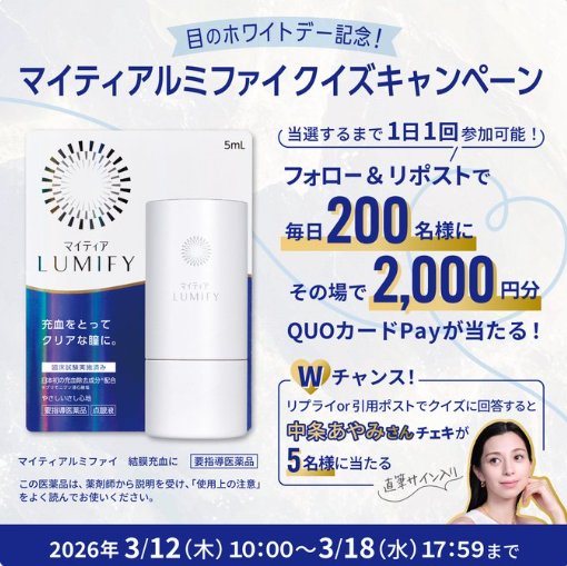 懸賞情報その場で当たる毎日200名様にQUOカードPayが当たる毎日応募Xキャンペーン 懸賞名:マイティアルミファイキャンペーン当選賞品:QUOカードPay 2,000円分当選人数:毎日200名様応募条件:X(Twitter)アカウントで毎日その場で当たる企業名:マイティア関連情報: 私の当選報告【QUOカードPay 500円分】 この懸賞に応募する(応募期間終了)2026年03月18日 17時59分今すぐ応募可能な懸賞はコチラから 見逃せない懸賞ディズニーシー パークチケット対象者全員グーン製品 無料サンプル毎月6,000名様子どもにピッタリの教材が見つかる!幼児向け教材をまとめました♪ジッパーバッグ / キーホルダー / QUOカード 500円分1,000名様 / 300名様 / 200名様ハウステンボス 1DAYパスポート付き オフィシャルホテル宿泊券 他16組32名様 他Disneyのおしりふき毎月1名様 応募可能な懸賞関連する当選報告 【ジョイフル本田×P&G】Wチャンスもアリ!Visa eギフトが当たる豪華キャンペーン残り28日きのこ組のオリジナルアイテムが当たるハガキキャンペーン2026年04月06日(応募コースによって異なります)最大1万円分のデジタルギフトカードが当たる花キューピットの母の日キャンペーン残り40日豪華観光列車で巡る大分ツアーが当たるクイズキャンペーン残り24日豪華グルメが当たるトラストナビのプレゼントキャンペーン定期開催クイックヘアカバー スプレー「マッシーニ」が必ずもらえるハガキキャンペーン締切日不明 日本ルナ「バニラヨーグルト」の新商品モニターに当選しました!パイロットコーポレーションのTwitter懸賞で「名入れボールペン」が当選しました!ポチカム「すごくうるおう!SPF50+PA++++ オンリーミネラルのファンデーション」当選です♪KAGOME「カゴメ劇場2016」の招待状が当選しました!LeivyのTwitter懸賞で「レイヴィー商品の豪華セット」が当選しました!日本アクセスの懸賞で「Delcy彩るおかず詰合せ」が当選しました☆ 関連情報: X懸賞(Twitter懸賞)オープン懸賞毎日応募ネット懸賞その場で当たる現金・金券・ギフト券大量当選SNS懸賞懸賞情報 電子マネー・ポイントQUOカードPay HOME懸賞情報応募方法SNS懸賞X懸賞(Twitter懸賞)毎日200名様にQUOカードPayが当たる毎日応募Xキャンペーン 2026年03月12日 更新:ものりんず@懸賞主婦【厳選】毎日応募 【全て】毎日応募