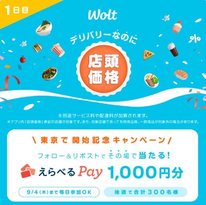 懸賞情報その場で当たるえらべるPay1,000円分が300名様にその場で当たるXキャンペーン 懸賞名:デリバリーなのに店頭価格 東京で開始記念キャンペーン当選賞品:えらべるPay 1,000円分当選人数:300名様応募条件:X(Twitter)アカウントで毎日その場で当たる企業名:Wolt この懸賞に応募する(応募期間終了)2025年09月04日今すぐ応募可能な懸賞はコチラから 見逃せない懸賞デジタルギフト 3,000円分10,000名様ミセス∞ハウス エプロン / ミセス∞ハウス QUOカード 1,000円分 / ハウス商品詰め合わせ400名様 / 300名様 / 300名様Panasonic 電気圧力鍋 / Nintendo Switch / LOGOS ポップフルシェルター 他1名様 / 1名様 / 1名様 他ヘナカラートリートメント無料サンプル応募者全員HYDEオリジナルデザインQUOカード各回666名様ベルメゾンのおすすめ商品(毎週変動)賞品によって異なります 応募可能な懸賞関連する当選報告 オリジナルゲーミングマイクが当たる森永製菓のクローズドキャンペーン残り18日グルメカタログギフトやサラダのトッピングが当たるクローズドキャンペーン残り48日最大30,000円分のAmazonギフトカードが当たるJCBの支払い方法変更キャンペーン残り14日625名様にその場でAmazonギフトカードが当たるXキャンペーン2026年01月15日(全16回開催)1万円相当のPayPayポイントが1,000名様に当たるニチレイのレシートキャンペーン残り17日BALMUDAトースターや旅行券なども当たるオハヨー乳業の豪華レシート懸賞残り17日 興和「コーワのケロコロランド プレゼントキャンペーン」宇治田原製茶場「こいまろインテリアバスケット」が当選しました♪タカオカチョコレートのTwitter懸賞で「チョコレート詰め合わせ」が当選しました♪キリンの懸賞で「TAMIYA ミニ四駆セット」が当選しました☆KIRIN「氷結専用ICE BOX」が当選しました☆BLOG monitor「ビューティマジック 毛穴凹凸補正」 関連情報: X懸賞(Twitter懸賞)オープン懸賞毎日応募ネット懸賞その場で当たる現金・金券・ギフト券SNS懸賞懸賞情報 電子マネー・ポイント HOME懸賞情報応募方法SNS懸賞X懸賞(Twitter懸賞)えらべるPay1,000円分が300名様にその場で当たるXキャンペーン 2025年09月02日 更新:ものりんず@懸賞主婦【厳選】毎日応募 【全て】毎日応募 クリスマス懸賞 年末年始懸賞