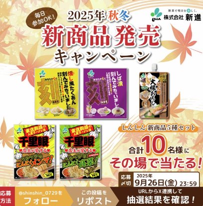 懸賞情報その場で当たる新進の新商品セットがその場で当たるXキャンペーン 懸賞名:7月29日は福神漬の日当選賞品:新商品セット当選人数:10名様応募条件:X(Twitter)アカウントで毎日その場で当たる企業名:新進 この懸賞に応募する(応募期間終了)2025年09月26日今すぐ応募可能な懸賞はコチラから 見逃せない懸賞QUOカードPay 1万円分1,0000名様図書カードギフト 最大5,000円分合計1,800名様気になっていたあの商品をお得に試せるサイト「サンプル百貨店」東京ディズニーシー スペシャルナイト招待+ホテル宿泊券 他5組10名様 他レッドブル半額クーポン150,000名様母子手帳ケース / しかけ絵本 / Amazonギフト券 5,000円分 他応募者全員 / 応募者全員 / 毎月10名様 他 応募可能な懸賞関連する当選報告 【マツキヨココカラ】豪華家電やグルメなどが当たるクローズドキャンペーンWEB:2025年11月15日 / ハガキ:2025年11月21日オリジナルぬいぐるみやマスコットが当たる森永乳業のクローズドキャンペーン残り20日ロッテのお菓子詰め合わせやえらべるPayが当たるクリスマスキャンペーン残り46日【実施店舗限定】グルメやキャンペーン対象商品セットも当たるクローズド懸賞残り49日最大79,000円分のえらべるPayが当たる味の素の豪華レシート懸賞2026年01月31日(全2回開催)落第忍者乱太郎のオリジナルグッズが当たるハガキキャンペーン2026年03月31日(全2回抽選) ホクトのキャンペーンで「DOCTORAIR 3Dエアストレッチマット」が当選しました!伊藤園「NEW TEAs’TEA 先行体験セット」が当選しました♪DCM&バスタのハガキ懸賞で「腰痛対策クッション」が当選しました♪P&Gのクローズド懸賞で「Panasonic スチーマー ナノケア」が当選しました!フィール×キッコーマンのハガキ懸賞で「キッコーマン豆乳詰め合わせ」が当選しました!ポチカム「SK-II自信の美容液『SK-IIステムパワー』サンプルプレゼント」に当選! 関連情報: X懸賞(Twitter懸賞)オープン懸賞毎日応募その場で当たるネット懸賞SNS懸賞食品・飲料懸賞情報 食品・グルメ詰め合わせ・セット HOME懸賞情報応募方法SNS懸賞X懸賞(Twitter懸賞)新進の新商品セットがその場で当たるXキャンペーン 2025年09月22日 更新:ものりんず@懸賞主婦【厳選】毎日応募 【全て】毎日応募 クリスマス懸賞 年末年始懸賞
