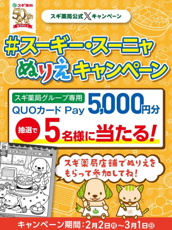 懸賞情報スギ薬局グループ専用QUOカードPayが当たるぬりえ投稿キャンペーン 懸賞名:X限定ぬりえキャンペーン当選賞品:スギ薬局グループ専用QUOカードPay 5,000円分当選人数:5名様応募条件:作品を投稿して応募企業名:スギ薬局 この懸賞に応募する2026年03月01日(残り20日) 見逃せない懸賞今田美桜直筆サイン入りウイスキー 陸 / 限定タンブラー+ウイスキー 陸 / QUOカード 500円分10名様 / 500名様 / 500名様コスメデコルテ 美白美容液サンプル10,000名様コズレオリジナルデザイン「出生届」メルマガ登録して必ずもらえるハローキティぬいぐるみ / グルメカタログギフト / えらべるPay 500円相当10,000名様 / 6,000名様 / 2,000名様ディズニー プライベート・イブニング・パーティー招待券 他各回合計1,000組2,500名様 他子どもにピッタリの教材が見つかる!幼児向け教材をまとめました♪ 応募可能な懸賞関連する当選報告 毎月抽選!最大5,000ポイントが当たる日本郵便のゆうパック郵送キャンペーン2026年03月31日(毎月末日)ドーミーイン・共立リゾートの無料宿泊券も当たる豪華キャンペーン残り74日1,000名様にポケモン・ガリガリ君 アウトドアグッズが当たるハガキ懸賞2026年04月30日(全3回開催)全プレ☆電子マネーギフトがかならずもらえるバーコード懸賞!残り325日【ママさん・妊婦さん限定】全プレもアリ☆豪華プレゼントキャンペーン♪毎月抽選毎月、百貨店ギフトカードなどが当たる日本百貨店協会のXキャンペーン定期開催 スギ薬局×サッポロのアプリ懸賞で「ご当地おつまみ」が当選しました!Suntoryのハガキ懸賞で「サントリー天然水ブランドの3種セット」が当選しました!ポッカサッポロのハガキ懸賞で「旅茶列島シリーズトライアルキット」が当選しました♪新日本スーパー×日清のキャンペーンで「どん兵衛食べ比べセット」が当選しました!富士薬品×メーカー9社のキャンペーンで「カタログギフト」が当選しました!テーブルマークのキャンペーンで「パックごはん詰め合わせ」が当選しました☆ 関連情報: X懸賞(Twitter懸賞)親子で応募できるコンテストオープン懸賞ネット懸賞現金・金券・ギフト券SNS懸賞コンテスト懸賞情報写真投稿・作品投稿 電子マネー・ポイント創作・アイデア絵・イラスト・ぬり絵QUOカードPayスギ薬局 HOME懸賞情報応募方法SNS懸賞X懸賞(Twitter懸賞)スギ薬局グループ専用QUOカードPayが当たるぬりえ投稿キャンペーン 2026年02月02日 更新:ものりんず@懸賞主婦【厳選】毎日応募 【全て】毎日応募 年末年始懸賞