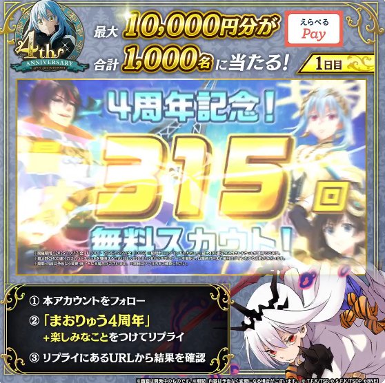 懸賞情報その場で当たる最大10,000円分のえらべるPayがその場で当たる豪華Xキャンペーン 懸賞名:ハズレなし! まおりゅう4周年記念当選賞品:えらべるPay 最大10,000円分当選人数:1,000名様応募条件:X(Twitter)アカウントで毎日その場で当たる企業名:バンダイナムコ この懸賞に応募する2025年11月04日 19時59分(残り2日) 見逃せない懸賞ニットバッグ / ステンレスマグ&ドリップコーヒー10,000名様 / 10,000名様グーン製品 無料サンプル毎月6,000名様幼児、小・中・高校生向け通信教育「スマイルゼミ」無料資料希望者全員のどごし[生]+赤いきつねうどん+緑のたぬき天そば 他100名様 他オリジナルQUOカード 500円分 / えらべるPay 1,000ポイント300名様 / 700名様母子手帳ケース / しかけ絵本 / Amazonギフト券 5,000円分 他応募者全員 / 応募者全員 / 毎月10名様 他 応募可能な懸賞関連する当選報告 毎月1,000名様にお試しスティックが当たるママ向けキャンペーン2026年02月28日(毎月末日)800名様に図書カードネットギフトが当たるクローズドキャンペーン2026年01月13日(全2回開催)毎月開催!JA広島の特産品が当たるクイズキャンペーン定期開催Wチャンスもアリ!豪華家電や600名様に当たるJA共済のアンケート懸賞2026年03月31日(全4回開催)町田啓太オリジナルQUOカードやオリジナルエプロンが当たるキャンペーン2025年11月30日(毎月抽選)『果てしなきスカーレット』完成披露試写会も当たるムビチケ前売券購入者限定キャンペーン2025年11月25日16:00(賞品によって異なります) イーアイデムのTwitter懸賞で「Amazonギフト券 5,000円分」が当選しました☆ヤマナカ×プリマハムのハガキ懸賞で「レゴランド・ジャパン1DAYパスポート」が当選しました!アピタ・ピアゴ&花王のハガキ懸賞で「ウルトラアタックNeoギフト」が当選しました♪ジョブフィールド「ウィンターキャンペーン」伊藤園「お~いお茶に合うこだわりの新米プレゼントキャンペーン」クスリのアオキ×ユニリーバのキャンペーンで「北陸カタログギフト」が当選しました! 関連情報: X懸賞(Twitter懸賞)オープン懸賞毎日応募その場で当たるネット懸賞豪華・高額懸賞現金・金券・ギフト券大量当選SNS懸賞懸賞情報 高額賞品・高級品電子マネー・ポイントバンダイ HOME懸賞情報応募方法SNS懸賞X懸賞(Twitter懸賞)最大10,000円分のえらべるPayがその場で当たる豪華Xキャンペーン 2025年11月01日 更新:ものりんず@懸賞主婦【厳選】毎日応募 【全て】毎日応募