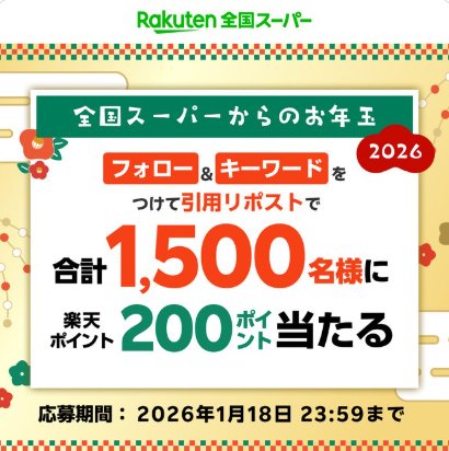 懸賞情報その場で当たる1,500名様に楽天ポイントがその場で当たるXキャンペーン 懸賞名:新春!楽天全国スーパーからのお年玉当選賞品:楽天ポイント 200ポイント当選人数:1,500名様応募条件:X(Twitter)アカウントで毎日その場で当たる企業名:楽天全国スーパー この懸賞に応募する(応募期間終了)2026年01月18日今すぐ応募可能な懸賞はコチラから 見逃せない懸賞映画ドラえもん限定グッズ各回500名様Amazonギフトカード 最大10,000円分毎月1,000名様コズレオリジナルデザイン「出生届」メルマガ登録して必ずもらえるイトメン製品&オリジナルレシピブック各回500名様JTBトラベルギフト 10万円分 / ビスケット詰め合わせ28名様 / 2,280名様汗取りインナー商品モニター6名様 応募可能な懸賞関連する当選報告 侍ジャパンシリーズ観戦チケットなどが当たるCoke ONアプリキャンペーン2026年02月28日(全2回開催)乳製品を使用したスイーツなどが当たる北海道牛乳購入キャンペーン2026年03月31日(全3回抽選)サンリオピューロランドのパスポートチケットも当たる豪華キャンペーン残り14日毎月開催♪ユニ・チャーム製品が当たるクイズキャンペーン!定期開催コスメデコルテの化粧水がサンプルでお試しできるキャンペーン残り14日毎月10名様にコーミ商品詰め合わせが当たるアンケートキャンペーン毎月開催 ポチカム「★新発売★300名様に『ルミーチェ ハリつやローション』を現品プレゼント」Suntory「特茶カフェインゼロの6本セット」が当選しました♪LINEマンガのTwitter懸賞で「映画鑑賞券」が当選しました♪小野万のレシート懸賞で「塩辛セット」が当選しました!花王「SOFINA iP クロロゲン酸 飲料」の無料モニターに当選しました!和光堂のTwitter懸賞で「ベビーソープ&ベビーローション」が当選しました! 関連情報: X懸賞(Twitter懸賞)オープン懸賞毎日応募その場で当たるネット懸賞現金・金券・ギフト券大量当選SNS懸賞年末年始懸賞懸賞情報 年末年始2025-2026電子マネー・ポイント楽天 HOME懸賞情報応募方法SNS懸賞X懸賞(Twitter懸賞)1,500名様に楽天ポイントがその場で当たるXキャンペーン 2026年01月07日 更新:ものりんず@懸賞主婦【厳選】毎日応募 【全て】毎日応募 年末年始懸賞
