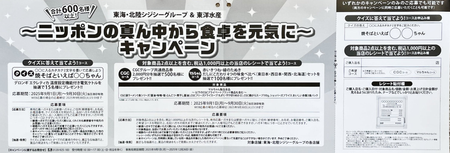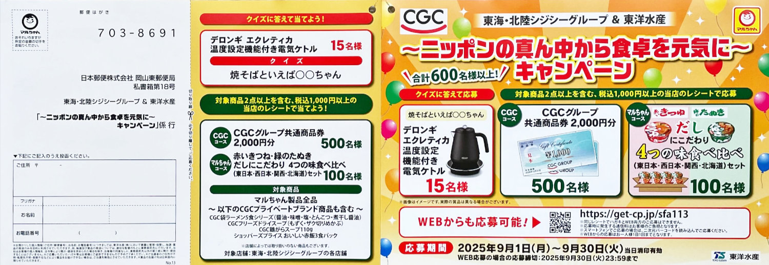 【東海・北陸CGCグループ×東洋水産】電気ケトルやマルちゃん詰め合わせが当たるキャンペーン