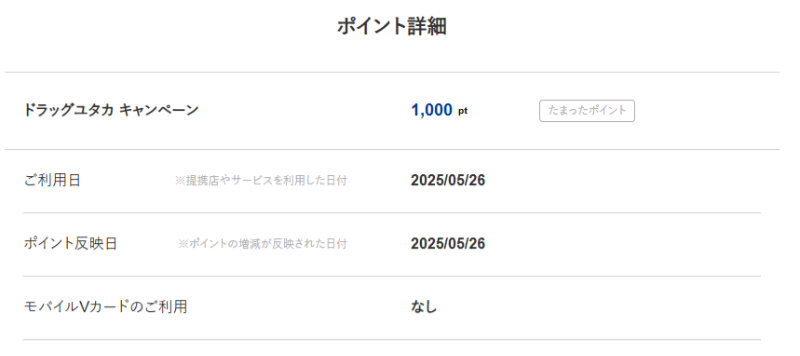 先日Vポイントの残高を見ていたのですが、ふと「ポイント履歴」が気になって詳細を見てみたんですよね。そしたら・・・!?なんとドラッグユタカのアプリ懸賞でVポイント 1,000ptの当選が2個もあったんですよ!