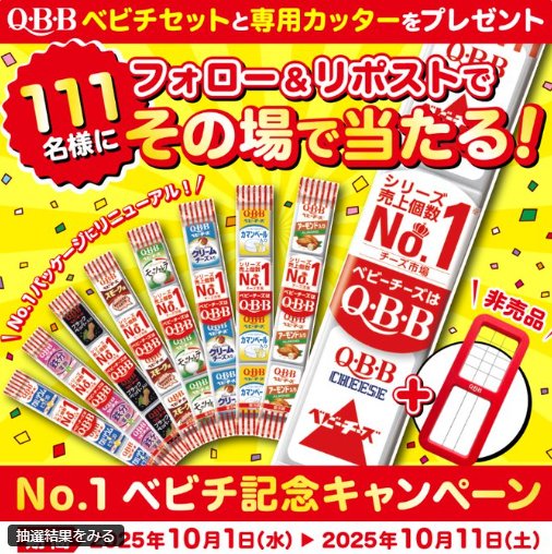 懸賞情報その場で当たるQBBベビチセット+専用カッターがその場で111名様に当たるキャンペーン 懸賞名:QBB No.1ベビチ記念キャンペーン当選賞品:QBBベビチセット+専用カッター当選人数:111名様応募条件:X(Twitter)アカウントで毎日その場で当たる企業名:六甲バター この懸賞に応募する2025年10月11日(残り10日) 見逃せない懸賞nanacoポイント 1,000円分1,000名様Tamagotchi Paradise / トートバッグ / 三幸製菓おやつ+ステッカー / スライダーポーチ10名様 / 190名様 / 200名様 / 1,000名様防災カタログギフト / Amazonギフトカード 1,000円分5名様 / 100名様Mrs. GREEN APPLE コラボグッズ1,090名様Ado DOME TOUR 2025ライブチケット / Adoコラボスピーカー / Coke ONドリンクチケット200名様 / 1,000名様 / 10万名様ベビーカー / 抱っこ紐 / ベビーベッド / Amazonギフト 10,000円分 他1名様 / 1名様 / 1名様 / 3名様 他 応募可能な懸賞関連する当選報告 1万円分のソニーポイントが当たる豪華プレゼントキャンペーン(本日最終日!!)毎月「Oh!Baby」シリーズアイテムが当たるクイズ懸賞♪毎月開催毎月開催☆文具や事務用品などが当たるナカバヤシのキャンペーン!定期開催毎月抽選!メリーズのおむつサンプルが当たるキャンペーン2025年12月31日(毎月抽選)毎月開催!豪華賞品が当たるメルマガ会員限定キャンペーン定期開催オリジナルQUOカードが当たるボートレース多摩川のLINEキャンペーン残り3日 Pigeon「タカナシLGGヨーグルト詰め合わせセット」が当選しました!エバラ食品「がっつりにんにく VS さっぱりおろし対決キャンペーン」サッポロビールのTwitter懸賞で「こいむぎ 1ケース」が当選しました!「10万円分のデジタルギフト」が神奈川県川崎競馬組合のキャンペーンで当選しました♪DHC「濃密コラーゲン!美容ドリンク 3本セット」グリコのクローズド懸賞で「収納スツール&DONBURI亭セット」が当選しました♪ 関連情報: X懸賞(Twitter懸賞)オープン懸賞毎日応募その場で当たるネット懸賞SNS懸賞食品・飲料懸賞情報生活用品・雑貨・家具 キッチングッズ|調理器具食品・グルメ詰め合わせ・セットQBB HOME懸賞情報応募方法SNS懸賞X懸賞(Twitter懸賞)QBBベビチセット+専用カッターがその場で111名様に当たるキャンペーン 2025年10月01日 更新:ものりんず@懸賞主婦【厳選】毎日応募 【全て】毎日応募