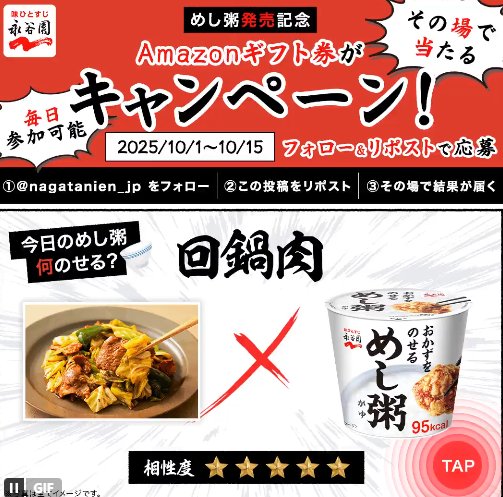 懸賞情報その場で当たる1,000名様にAmazonギフト券500円分がその場で当たるXキャンペーン 懸賞名:めし粥発売記念キャンペーン当選賞品:Amazonギフト券 500円分当選人数:1,000名様応募条件:X(Twitter)アカウントで毎日その場で当たる企業名:永谷園 この懸賞に応募する2025年10月15日(残り14日) 見逃せない懸賞ビオレおすすめサンプルセット不明エリクシール 新シワ改善クリーム サンプル1万名様入園無料招待券、グルメなど賞品によって異なります年末ジャンボ宝くじ1,000名様Glicoのおいしい塩分量シリーズセット / BRUNO マルチ圧力クッカー700名様 / 300名様パンパース オムツ毎月1名様 応募可能な懸賞関連する当選報告 シナモロールグッズやデジタルギフトなども当たる大量当選クローズドキャンペーン残り64日1,000名様にザバス 限定ウェアが当たるクローズドキャンペーン残り30日Amazonギフトカードや有名音響機器が当たるAmazonMusicのSNSキャンペーン残り9日各回200名様にアロエ鉢が当たるハガキキャンペーン年3回抽選葉酸800μg配合のエレビット無料サンプルがもらえるキャンペーン☆なくなり次第終了キャスト登壇舞台挨拶付きジャパンプレミア招待券も当たる豪華懸賞2025年11月04日(賞品によって異なります) キユーピーのキャンペーンで「USJスタジオ・パス」が当選しました!アピタ・ピアゴ&日本製粉のハガキ懸賞で「パスタ楽らくパン」が当選しました!バロー・森永のハガキ懸賞で「おいしいコラーゲンドリンク」が当選しました!モニプラで「ナガシマスパーランド 親子ペアチケット」が当選しました☆アピタ・ピアゴ×サントリーのハガキ懸賞で「発酵フードメーカー」が当選しました!バロー×おやつカンパニーのハガキ懸賞で「名古屋港水族館 親子4名分チケット」が当選しました! 関連情報: X懸賞(Twitter懸賞)オープン懸賞毎日応募その場で当たるネット懸賞現金・金券・ギフト券大量当選SNS懸賞懸賞情報 Amazonギフト券商品券・ギフト券・金券永谷園 HOME懸賞情報応募方法SNS懸賞X懸賞(Twitter懸賞)1,000名様にAmazonギフト券500円分がその場で当たるXキャンペーン 2025年10月01日 更新:ものりんず@懸賞主婦【厳選】毎日応募 【全て】毎日応募