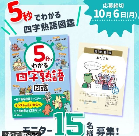 懸賞情報商品モニター『5秒でわかる四字熟語図鑑』がお試しできる商品モニターキャンペーン キャンペーン名:大好評!5秒でわかるシリーズ第2弾当選賞品:『5秒でわかる四字熟語図鑑』商品モニター当選人数:15名様応募条件:X(Twitter) または Instagramアカウントで応募企業名:学研コメント:※対象商品到着後、2週間以内に実際に商品をお使いいただき、自身のSNSに投稿してください など条件ありX(Twitter)アカウントでの応募2025年10月06日(残り4日)Instagramアカウントでの応募2025年10月06日(残り4日) 見逃せない懸賞商品券 最大5,000円分合計52,000名様ハウステンボス 1DAYパスポート付き オフィシャルホテル宿泊券 他16組32名様 他combi チャイルドシート / Amazonギフトカード 3万円分 / Apple Watch SE 他1名様 / 2名様 / 2名様 他アサヒ贅沢搾り コンビニ無料引換えクーポン100,000名様Toffyホットプレートミニ / Qooキャリーケース / Qoo親子パーカー 他150名様 / 150名様 / 3000名様 他グリコ商品いろいろ賞品によって異なります 応募可能な懸賞関連する当選報告 京都丹後の伝統「ちりめん」から生まれた化粧品の無料サンプルプレゼント☆毎月開催ロトのボスジャン or QUOカードが当たるサントリーのハガキキャンペーン残り59日コスメデコルテのユース パワー エッセンス ローションがサンプルでお試しできるキャンペーン残り14日2万円分のギフト券やむき栗アソートセットも当たるハガキキャンペーン年4回抽選スタジオアリス撮影無料券も当たるママ向けキャンペーン♪残り13日【無料体験可能】子ども向け「習い事・プログラミング教室」残り355836日 コノミヤ×サントリーのハガキ懸賞で「折りたたみサイドテーブル」が当選しました!サークルKサンクス「+Kラッキースタートキャンペーン – 第2弾 – 」バンダイのハガキ懸賞で「アンパンマンおかたづけBOX」が当選しました☆タカラトミー「リカちゃんをはじめよう!ドリームキャンペーン」マックスバリュ中部&コーミの懸賞で「デザートブッフェ券」が当選しました♪マツモトキヨシ&花王のキャンペーンで「コンパクトホットプレート」が当選しました♪ 関連情報: X懸賞(Twitter懸賞)育児・子育て懸賞オープン懸賞ネット懸賞Instagram懸賞SNS懸賞商品モニターベビー・キッズ・おもちゃ懸賞情報文具・書籍・映像 本・電子書籍・マンガ限定条件あり懸賞育児・子育て学研|Gakken HOME懸賞情報応募方法SNS懸賞X懸賞(Twitter懸賞)『5秒でわかる四字熟語図鑑』がお試しできる商品モニターキャンペーン 2025年10月01日 更新:ものりんず@懸賞主婦【厳選】毎日応募 【全て】毎日応募