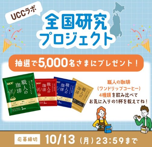 懸賞情報商品モニター5,000名様にコーヒー飲み比べセットが当たる全国研究プロジェクトキャンペーン キャンペーン名:5,000人で作る⁈全国研究プロジェクト当選賞品:コーヒー飲み比べセット当選人数:5,000名様応募条件:会員登録して応募企業名:UCCコメント:※選ばれた研究員は4種類を飲み比べ、一番好みのブレンドを記載して「コーヒーギャラリー」に投稿してください など条件あり この懸賞に応募する2025年10月13日(残り11日) 見逃せない懸賞ユースキン ミッフィーポンプ / サンプル30名様 / 1万名様JVCケンウッド製品 / QUOカード 1,000円分100名様 / 900名様カウネット オリジナル商品毎月50名様ハーゲンダッツ引換券10,000名様nanacoポイント 1,000円分1,000名様妊婦さん必見!無料で試せる「紙おむつ・粉ミルク」のお得情報 BEST10♪ 応募可能な懸賞関連する当選報告 毎月1,000名様に最大10,000円分のアマギフが当たる豪華キャンペーン2026年03月20日(毎月開催)【西日本エリア限定】そのお買い物が0になる!亀田製菓のオトクなキャンペーン残り8日アスタリフトのファンデ無料サンプルセットが全員お試しできる♪締切日不明毎月開催♪ユニ・チャーム製品が当たるクイズキャンペーン!定期開催すき家の牛丼食事券が当たるリクエストキャンペーン残り15日【コモディイイダ×メーカー各社】東京ディズニーリゾートご招待!残り17日 ニチベイ×ハローキティの懸賞で「ハローキティクリアファイル」が当選しました☆ウォーカープラス×Suntory「金麦 12缶セット」が当選しました!第2広報室「coyori(コヨリ)美容液オイル」無料モニターが当選しました☆花王のクローズド懸賞で「ビオレ商品詰め合わせ」が当選しました!コノミヤ×エスビーのキャンペーンで「BRUNO 低温調理器」が当選しました!DyDoのハガキ懸賞で「ル・クルーゼ ペア・ショート・タンブラー」が当選しました! 関連情報: オープン懸賞ネット懸賞大量当選商品モニター食品・飲料懸賞情報 限定条件あり懸賞詰め合わせ・セットドリンク・飲料コーヒー会員登録UCC HOME懸賞情報応募方法ネット懸賞5,000名様にコーヒー飲み比べセットが当たる全国研究プロジェクトキャンペーン 2025年10月02日 更新:ものりんず@懸賞主婦【厳選】毎日応募 【全て】毎日応募