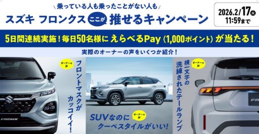 懸賞情報毎日50名様にえらべるPay1,000ポイントがその場で当たるXキャンペーン 懸賞名:フロンクスのここが推せるキャンペーン当選賞品:えらべるPay 1,000ポイント当選人数:毎日50名様応募条件:X(Twitter)アカウントで毎日応募企業名:スズキ この懸賞に応募する(応募期間終了)2026年02月21日 11時59分今すぐ応募可能な懸賞はコチラから 見逃せない懸賞PayPayポイント 最大1万円相当110万10名様ボディメンテオールスターズ ファンミーティング参加チケット 他500組1,000名様 他オルビス無料サンプルセット応募者全員フライパンセット / 手のりたまクッション / 丸美屋商品セット毎週250名様 / 毎週250名様 / 5,000名様Amazonギフトカード 200円分1,000名様母子手帳ケース / しかけ絵本 / Amazonギフト券 5,000円分 他応募者全員 / 応募者全員 / 毎月10名様 他 応募可能な懸賞関連する当選報告 【アプリ懸賞】体験プログラムやカルビー商品に応募できるキャンペーン♪随時開催全プレ!大谷翔平選手のクリアファイルがもらえるキャンペーン!クリアファイルがなくなり次第終了最大3万円分のキャッシュバック!シャープのお得なキャンペーン残り47日アマギフやジェラートピケの育児アイテムが当たる豪華アンケートキャンペーン残り23日毎月50名様にQUOカードが当たる会員限定キャンペーン♪毎月開催レッドブル・レーシングのサイン入りジャケットが当たるキャンペーン残り37日 ヤマナカ&ヤマダイのハガキ懸賞で「凄麺12種類セット」が当選しました♪和光堂「わこちゃんカフェ」会員限定ミルクモニターに当選しました♪伊藤園のTwitter懸賞で「充実野菜の3種セット」が当選しました☆マックスバリュ中部×Nipponhamのハガキ懸賞で「スポーツタオルセット」が当選しました♪ライオンのキャンペーンで「1年分の歯ブラシセット」が当選しました!LIXILビバ&花王のハガキ懸賞で「Panasonicヘアドライヤー」が当選しました☆ 関連情報: X懸賞(Twitter懸賞)オープン懸賞毎日応募ネット懸賞現金・金券・ギフト券SNS懸賞懸賞情報 電子マネー・ポイントSUZUKI|スズキ HOME懸賞情報応募方法SNS懸賞X懸賞(Twitter懸賞)毎日50名様にえらべるPay1,000ポイントがその場で当たるXキャンペーン 2026年02月16日 更新:ものりんず@懸賞主婦【厳選】毎日応募 【全て】毎日応募
