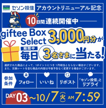 懸賞情報毎日3名様に3,000円分のgiftee Box Selectが当たるXキャンペーン 懸賞名:X公式アカウントのリニューアル記念当選賞品:giftee Box Select 3,000円分当選人数:毎日3名様応募条件:X(Twitter)アカウントで毎日応募企業名:セゾン投信 この懸賞に応募する2025年10月13日(残り7日) 見逃せない懸賞コーヒー飲み比べセット5,000名様食事券 500円分1,000名様はじめてのベビースタイ応募者全員PayPayポイント 最大20万円分 / 直筆サイン入りグッズ9,988名様 / 合計12名様ハーゲンダッツ引換券10,000名様電動自転車 / ベビーカー / ダイソン掃除機 ほか合計1,098名様 応募可能な懸賞関連する当選報告 200名様にPayPayポイントがその場で当たるXキャンペーン残り55日味の素の新製品&リニューアル品がその場で当たる会員限定キャンペーン残り29日ハウスオブローゼの厳選商品が当たるレビュー投稿キャンペーン!毎月開催ファッショングッズや美容アイテムが当たる「ELLE」の定期懸賞残り11日ウイングのブラや肌着の商品モニターキャンペーン♪残り1日グリーンティー&京丸製菓の和菓子詰め合わせが当たるハガキキャンペーン2025年11月01日(全2回開催) KIRIN「いくぜ8月!!日がわり夏のキリン祭り」ごちぽんで「ふりかけとろろセット」が当選しました♪アサヒのLINE懸賞で「贅沢搾りマンゴー」が当選しました♪サントリーのハガキ懸賞で「チョコレートファウンテン」が当選しました!Valor・LOTTE共同企画「バロー商品券1,000円分」が当選しました♪ポッカサッポロのハガキ懸賞で「旅茶列島トライアルキット」が当選しました! 関連情報: X懸賞(Twitter懸賞)オープン懸賞毎日応募ネット懸賞現金・金券・ギフト券SNS懸賞懸賞情報 ギフトコード|デジタルギフト HOME懸賞情報応募方法SNS懸賞X懸賞(Twitter懸賞)毎日3名様に3,000円分のgiftee Box Selectが当たるXキャンペーン 2025年10月06日 更新:ものりんず@懸賞主婦【厳選】毎日応募 【全て】毎日応募