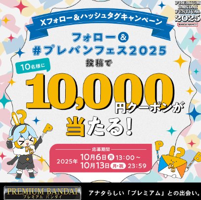 懸賞情報10,000円OFFクーポンが当たるバンダイの毎日応募Xキャンペーン 懸賞名:プレバンフェス2025 フォロー&ハッシュタグキャンペーン当選賞品:10,000円OFFクーポン当選人数:10名様応募条件:X(Twitter)アカウントで毎日応募企業名:バンダイ この懸賞に応募する2025年10月13日(残り6日) 見逃せない懸賞コンボ ピュア ドッグ 超小粒 お試し品5,000名様PayPayポイント 最大100,000円相当合計22万名様カウネット オリジナル商品毎月50名様Toffyホットプレートミニ / Qooキャリーケース / Qoo親子パーカー 他150名様 / 150名様 / 3000名様 他電気圧力鍋 / T-falマルチパン / 丸美屋商品詰め合わせ毎週100名様 / 毎週200名様 / 10,000名様サイベックス ミオス ベビーカー / 洗えるベビー布団セット / パナソニック 電動自転車 他1名様 / 3名様 / 1名様 他 応募可能な懸賞関連する当選報告 【いなげや×森永乳業】オリジナルクリスマスケーキ プレゼントキャンペーン残り25日ハウステンボス1DAYパス付きホテル宿泊券も当たるユースキン製薬の豪華懸賞2026年03月31日(全4回開催)1,001名様に日本全国の厳選地酒が当たるレシートキャンペーン残り24日【オークワ×プリマハム】宝塚歌劇 花組貸切公演 ご招待キャンペーン残り59日ユースキンミッフィーポンプやサンプルが当たるキャンペーン残り54日4,000円分のゆず庵アプリクーポンが当たる、ゆずフォト投稿キャンペーン残り20日 アピタ・ピアゴ/JA全農とやまのハガキ懸賞で「富山産品ギフトカタログ」が当選しました☆和光堂のTwitter懸賞で「ベビーソープ&ベビーローション」が当選しました!Suntory×バローのハガキ懸賞で「宇都宮餃子3種セット」が当選しました♪ニチバンのハガキ懸賞で「ベイクドチーズケーキ&ショコラノワール」が当選しました!ライオンのキャンペーンで「1年分の歯ブラシセット」が当選しました!「ディズニーチケット」がキッコーマンの懸賞で当選しました!&ディズニー当選のコツ♪ 関連情報: X懸賞(Twitter懸賞)オープン懸賞毎日応募ネット懸賞豪華・高額懸賞現金・金券・ギフト券SNS懸賞懸賞情報 高額賞品・高級品商品券・ギフト券・金券バンダイ HOME懸賞情報応募方法SNS懸賞X懸賞(Twitter懸賞)10,000円OFFクーポンが当たるバンダイの毎日応募Xキャンペーン 2025年10月07日 更新:ものりんず@懸賞主婦【厳選】毎日応募 【全て】毎日応募