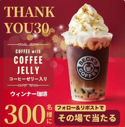 懸賞情報その場で当たるベックスコーヒー30周年アニバーサリードリンクが当たるXキャンペーン 懸賞名:フォロー&リポストキャンペーン当選賞品:30周年アニバーサリードリンク クーポン当選人数:300名様応募条件:X(Twitter)アカウントで毎日その場で当たる企業名:ベックスコーヒーショップ この懸賞に応募する2025年10月12日(残り4日) 見逃せない懸賞ヘナカラートリートメント無料サンプル応募者全員デジタルギフト 500円相当 / 特製鍋焼うどん / 鍋島焼のプレミアムどんぶり10,000名様 / 2,000名様 / 300名様Disneyのおしりふき毎月1名様最大8,000Pontaポイント8,000名様やかんの麦茶1本無料Coke ONドリンクチケット / デジタルポイント 3,000円分100,000名様 / 6,000名様combi チャイルドシート / Amazonギフトカード 3万円分 / Apple Watch SE 他1名様 / 2名様 / 2名様 他 応募可能な懸賞関連する当選報告 電子ギフト1,000円分が1,000名様に当たる日本ハムのレシートキャンペーン残り23日湖池屋プライドのセットが50名様にその場で当たるXキャンペーン締切日不明AGF商品やオリジナルマグカップなどが当たるポイントキャンペーン締切日不明毎月開催!入眠グッズやワコールのパジャマも当たるX投稿キャンペーン!毎月開催お子さんの名前入りえほんが無料でもらえるママさん向けキャンペーン☆締切日不明ディズニーの仲間たちと一緒に写真撮影が楽しめるキャラクターグリーティング招待券が当たるキャンペーン2025年10月31(毎月開催) BLOG monitor「ビューティマジック 毛穴凹凸補正」KIRIN「BITTERS エクストラビター 先行モニターキャンペーン」アヲハタのキャンペーンで「みかん&ぶどうジュース」が当選しました♪NET ViVi「Carina パウチサンプリングプレゼント」イオンクレジット「公共料金キャンペーン」小田急百貨店「MAISON TROISGROS フルーツドリンク」が当選しました☆ 関連情報: X懸賞(Twitter懸賞)オープン懸賞毎日応募その場で当たるネット懸賞無料クーポン・引換券SNS懸賞懸賞情報 ドリンク・飲料クーポン・無料券コーヒー HOME懸賞情報応募方法SNS懸賞X懸賞(Twitter懸賞)ベックスコーヒー30周年アニバーサリードリンクが当たるXキャンペーン 2025年10月08日 更新:ものりんず@懸賞主婦【厳選】毎日応募 【全て】毎日応募