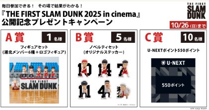 懸賞情報その場で当たる湘北メンバーのフィギュアやU-NEXTポイントなどがその場で当たるX懸賞 懸賞名:『THE FIRST SLAM DUNK 2025 in cinema』 公開記念プレゼントキャンペーン当選賞品&当選人数:A賞:フィギュアセット(1名様)B賞:ノベルティセット(5名様)C賞:U-NEXTポイント 550ポイント(10名様)応募条件:X(Twitter)アカウントで毎日その場で当たる企業名:東映アニメーション この懸賞に応募する2025年10月26日(残り12日) 見逃せない懸賞熟成布巻きロースハム&鎌倉ビール / 電子ギフト 1,000円分50名様 / 1,000名様鬼滅の刃 オリジナル集合アクスタ / リロホテルズ&リゾーツ 平日ペア宿泊券1,000名様 / 50組100名様しまじろうのおうちブロックBOX / T-fal ラクラ・クッカー 他合計500名様えらべるPay 最大10,000円分 / ヨーグルトギフト券3,500名様 / 100名様Amazonギフト券 500円分1,000名様こどもちゃれんじ資料&年齢別体験セット応募者全員 応募可能な懸賞関連する当選報告 【LINE懸賞】毎月開催!プレミアムQUOカードが当たるプレゼントキャンペーン♪毎月開催選べる体験ギフト おもてなしの宿が当たるコスモ石油の給油キャンペーン残り47日AGF商品やオリジナルマグカップなどが当たるポイントキャンペーン締切日不明毎日2名様にサロニアのヘアアイロンなどが当たる豪華Xキャンペーン残り2日毎月30名様にAmazonギフトが当たるバンプレストのアンケートキャンペーン毎月抽選最大10,000円分のAmazonギフトコードが30名様に当たるXキャンペーン残り13日 アキモのハガキ懸賞で「栃木名産にっこり梨セット」が当選しました♪丸大食品のX懸賞で「フライパンジュウ」が当選しました!3Mジャパンのハガキ懸賞で「ハーゲンダッツ ミニカップセット」が当選しました♪S&Bのキャンペーンで「ハローキティのキッチンマット」が当選しました☆Yストア・グリコのキャンペーンで「セレクション・ザ・グリコ ミニ」が当選しました!フィール×森永製菓×キリンのハガキ懸賞で「森永・キリン商品詰め合わせ」が当選しました♪ 関連情報: X懸賞(Twitter懸賞)オープン懸賞毎日応募その場で当たるネット懸賞現金・金券・ギフト券SNS懸賞ベビー・キッズ・おもちゃ懸賞情報 アニメ・キャラクター詰め合わせ・セット電子マネー・ポイント HOME懸賞情報応募方法SNS懸賞X懸賞(Twitter懸賞)湘北メンバーのフィギュアやU-NEXTポイントなどがその場で当たるX懸賞 2025年10月14日 更新:ものりんず@懸賞主婦【厳選】毎日応募 【全て】毎日応募
