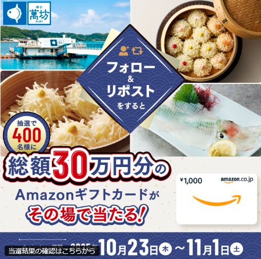 懸賞情報その場で当たる総額30万円分のAmazonギフトカードがその場で当たるX懸賞 懸賞名:フォロー&リポストキャンペーン当選賞品:Amazonギフトカード 最大1万円分当選人数:400名様応募条件:X(Twitter)アカウントで毎日その場で当たる企業名:呼子萬坊 この懸賞に応募する2025年11月01日(残り8日) 見逃せない懸賞デジタルポイント 最大10,000円分1,550名様電気圧力鍋 / T-fal マルチパン / 丸美屋商品セット毎週100名様 / 毎週200名様 / 10,000名様現金、カタログギフト、ギフトカードなど(月替り)賞品によって異なりますえらべるPay 最大1,000円分 / アサヒスーパードライ ドライクリスタル29,000名様 / 300名様Amazonギフトカード 500円分10,000名様デジタルギフト 最大5,000円分合計12名様 応募可能な懸賞関連する当選報告 地縛少年花子くんのグッズがもらえる吉野家アプリポイントキャンペーン残り7日全プレもアリ!豪華賞品が当たる丸大のレシートキャンペーン2026年03月03日(全3回抽選)年末ジャンボ宝くじが当たる森永のレシートキャンペーン残り17日1万円分のスシロー食事券が当たる豪華X懸賞!不定期開催オリジナルデザインQUOカードがその場で当たるクローズドキャンペーンキャンペーン告知パッケージがなくなり次第終了図書カードNEXT散漫円や図鑑セットなども当たる自由研究コンクール残り7日 キンレイのキャンペーンで「お水がいらない ラーメン北魁4食セット」が当選しました♪ブルボンのキャンペーンで「新商品詰め合わせ」が当選しました!ミューズ「キッチンミューズ 本体」が当選しました♪アピタ・ピアゴ&花王のハガキ懸賞で「ウルトラアタックNeoギフト」が当選しました♪ポッカサッポロのハガキ懸賞で「旅茶列島トライアルキット」が当選しました!不二家のTwitter懸賞で「ご当地カントリーマアム」が当選しました! 関連情報: X懸賞(Twitter懸賞)オープン懸賞毎日応募その場で当たるネット懸賞豪華・高額懸賞現金・金券・ギフト券SNS懸賞懸賞情報 高額賞品・高級品Amazonギフト券商品券・ギフト券・金券 HOME懸賞情報応募方法SNS懸賞X懸賞(Twitter懸賞)総額30万円分のAmazonギフトカードがその場で当たるX懸賞 2025年10月24日 更新:ものりんず@懸賞主婦【厳選】毎日応募 【全て】毎日応募