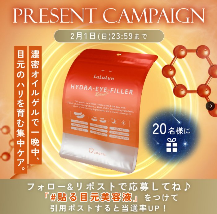 懸賞情報 ルルルンの貼る目元美容液が当たる毎日応募Xキャンペーン 懸賞名:プレゼントキャンペーン当選賞品:貼る目元美容液当選人数:20名様応募条件:X(Twitter)アカウントで毎日応募企業名:ルルルン この懸賞に応募する2026年02月01日(残り2日) 見逃せない懸賞 ユニバーサル・エクスプレス・パス毎日最大30組様リキッドファンデ サンプル10,000名様【無料体験可能】子ども向け「習い事・プログラミング教室」旅行券 10万円分 / 最大1,000Pontaポイント1名様 / 1,000名様NOBROCK TVオリジナルグッズ1,205名様Panasonic 電気圧力鍋 / Nintendo Switch / LOGOS ポップフルシェルター 他1名様 / 1名様 / 1名様 他 応募可能な懸賞 関連する当選報告 最大10万円分のソニーストアで使える買い物券がその場で当たる豪華懸賞残り61日総額100万円相当の賞品が当たるLINEMOの豪華キャンペーン残り9日赤楚衛ニQUOカードやオリジナルキャップが当たるブルボンのレシート懸賞残り1日【レディ薬局×大王製紙】春休み!親子工場見学キャンペーン残り29日カタログギフトやQUOカードPayが当たるニチバンのクローズドキャンペーン残り1日【実体験】妊娠中の懸賞は当選しやすい!妊婦さんにオススメの懸賞活動☆残り355716日 テレビ朝日のTwitter懸賞で「PayPayポイント1万円分」が当選しました!スギヤマ×meijiのハガキ懸賞で「”新”アミノコラーゲン」の無料モニターに当選しました♪全国ビスケット協会のキャンペーンで「ビスケットの詰め合わせ」が当選しました☆スギ薬局×エスエス製薬「ブラウン マルチクイック」が当選しました☆おかしのまちおか×三幸製菓のハガキ懸賞で「QUOカード 500円分」が当選しました!P&Gのハガキ懸賞で「P&G商品ギフトセット」が当選しました♪ 関連情報: X懸賞(Twitter懸賞)オープン懸賞毎日応募ネット懸賞SNS懸賞美容・健康・コスメ懸賞情報 スキンケア美容グッズ HOME懸賞情報応募方法SNS懸賞X懸賞(Twitter懸賞)ルルルンの貼る目元美容液が当たる毎日応募Xキャンペーン 2026年01月26日 更新:ものりんず@懸賞主婦 【厳選】毎日応募 【全て】毎日応募 年末年始懸賞