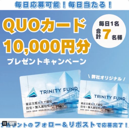 懸賞情報その場で当たるオリジナルQUOカード10,000円分が当たる豪華毎日応募X懸賞 懸賞名:カウントダウンキャンペーン当選賞品:オリジナルQUOカード 10,000円分当選人数:毎日1名様応募条件:X(Twitter)アカウントでその場で当たる企業名:TRINITY FUND この懸賞に応募する2025年10月31日(残り4日) 見逃せない懸賞ベビー育児グッズ、ギフト券など賞品によって異なりますAKB48サイン入りチェキ / AKB48アクスタ / QUOカードPay 1,000円分 他48名様 / 400名様 / 200名様 他ベルメゾンのおすすめ商品(毎週変動)賞品によって異なります伊藤園×MLBコラボ オリジナルマイボトル1,000名様ミルク商品モニター毎週400名様ベビーカー / 抱っこ紐 / ベビーベッド / Amazonギフト 10,000円分 他1名様 / 1名様 / 1名様 / 3名様 他 応募可能な懸賞関連する当選報告 毎月10名様にKATEスペシャルセットが当たる推しKATE投稿キャンペーン毎月開催毎月抽選!Amazonギフト券2,000円分が当たる、在庫車両問い合わせキャンペーン毎月開催合計10万名様にお菓子BOXやエコバッグが当たるカルビー大収穫祭キャンペーン2025年12月08日(全10回抽選)最新オーブンレンジが当たる「10月1日はオーブンレンジの日」キャンペーン残り34日湖池屋のお菓子詰め合わせが当たる会員限定プレゼントキャンペーン残り4日ピュレアのフェイスマスクがお試しできる商品モニターキャンペーン残り2日 THERMOSのハガキ懸賞で「ホタテ片貝」が当選しました!FamilyMartのキャンペーンで「QUOカード 5,000円分」が当選しました!森永のキャンペーンで「森永のやさしい米麹甘酒30本」が当選しました♪小野万のレシート懸賞で「塩辛セット」が当選しました!ニチバンのハガキ懸賞で「ベイクドチーズケーキ&ショコラノワール」が当選しました!マックスバリュ東海×不二家のハガキ懸賞で「アンパンマンケーキ」が当選しました! 関連情報: X懸賞(Twitter懸賞)オープン懸賞ネット懸賞その場で当たる豪華・高額懸賞現金・金券・ギフト券SNS懸賞懸賞情報 高額賞品・高級品QUOカード HOME懸賞情報応募方法SNS懸賞X懸賞(Twitter懸賞)オリジナルQUOカード10,000円分が当たる豪華毎日応募X懸賞 2025年10月27日 更新:ものりんず@懸賞主婦【厳選】毎日応募 【全て】毎日応募