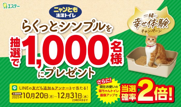 懸賞情報ニャンとも清潔トイレ「らくっとシンプル」が1,000名様に当たるキャンペーン 懸賞名:一緒に幸せ体験キャンペーン当選賞品:ニャンとも清潔トイレ「らくっとシンプル」当選人数:1,000名様応募条件:LINEアカウントで応募企業名:エステー この懸賞に応募する2025年12月31日(残り33日) 見逃せない懸賞QUOカード 1,000円分 / 秋田県産米 / 丸美屋商品詰め合わせ毎月600名様 / 毎月100名様 / 毎月800名様JTBトラベルギフト 10万円分 / えらべるPay 10万円分 / 専用QUOカードPay 最大3万円分15名様 / 15名様 / 10,100名様BEAUTY & YOUTH UNITED ARROWS コラボPCリュック / e-GIFT 3,000円分1,000名様 / 500名様敏感肌用オールインワンジェル お試し無料モニター応募者全員QUOカードPay 最大1万円分合計10,000名様Amazonギフト券 10,000円分 / ジェラートピケ ママバッグ3名様 / 1名様 応募可能な懸賞関連する当選報告 毎月抽選!QUOカードや秋田県産米も当たる丸美屋の大量当選ハガキ懸賞2026年01月31日(毎月抽選)しなこ×タピまるクッションやQUOカードが当たるクローズドキャンペーン残り33日キレイとゲンキの応援グッズが当たるファンケルの定期便利用キャンペーン残り37日ガシャポンオンラインで使える1,000円相当のクーポンが当たるLINEキャンペーン毎月開催タケヤキ翔のオリジナルQUOカードが当たるカラオケDAMの歌唱キャンペーン残り16日インスタントラーメン詰め合わせなどが当たるクイズラリーキャンペーン残り10日 ヤクルトのハガキ懸賞で「オリジナルピクニックセット」が当選しました☆伊藤園のキャンペーンで「お~いお茶に合う特選米」が当選しました!平和堂×東洋水産のハガキ懸賞で「ご当地カップ麺詰め合わせ」が当選しました!ポチカム「★新発売★300名様に『ルミーチェ ハリつやローション』を現品プレゼント」コノミヤ・日清フーズのハガキ懸賞で「クリスマスケーキ」が当選しました☆Johnsonの懸賞で「ジョンソン製品詰め合わせ」が当選しました♪ 関連情報: オープン懸賞LINE懸賞ネット懸賞SNS懸賞大量当選懸賞情報その他 ペット・動物・生き物エステー HOME懸賞情報応募方法SNS懸賞LINE懸賞ニャンとも清潔トイレ「らくっとシンプル」が1,000名様に当たるキャンペーン 2025年10月30日 更新:ものりんず@懸賞主婦【厳選】毎日応募 【全て】毎日応募 クリスマス懸賞 年末年始懸賞