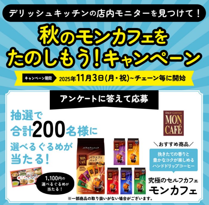 懸賞情報その場で当たる【開催チェーン限定】選べるグルメが当たるアンケートキャンペーン 懸賞名:【開催チェーン限定】デリッシュキッチン 秋のモンカフェをたのしもう!キャンペーン当選賞品:選べるグルメ当選人数:200名様応募条件:アンケートに答えて応募企業名:FOODAYS この懸賞に応募する2025年11月30日(開催チェーンによって異なります) 見逃せない懸賞キャンペーン限定ムーミングッズ / えらべるPay 500円分200名様 / 1,180名様ザ・ベゼルズ無料引換券不明月刊ポピーの無料おためし見本応募者全員ナチュラの 吸水パッド券引換券8,000名様Toffyホットプレートミニ / Qooキャリーケース / Qoo親子パーカー 他150名様 / 150名様 / 3000名様 他コスメ、美容グッズモニター・サンプルなど賞品によって異なる 応募可能な懸賞関連する当選報告 銘柄和牛1万円相当が当たる動画視聴キャンペーン残り141日岩手県にちなんだ豪華賞品が当たるタカナシ乳業のクローズドキャンペーン残り25日【オークワ×プリマハム】宝塚歌劇 花組貸切公演 ご招待キャンペーン残り25日ムーミンのコラボオリジナルトートバッグが当たるカルビーのクローズド懸賞残り44日1,000円分の図書カードネットギフトが111名様に当たるキャンペーン残り6日pdcのマスカラが当たるLINE友だち限定キャンペーン残り10日 コカ・コーラのキャンペーンで「9種から選べるスタミナ料理」が当選しました!Yストア・伊藤ハムのハガキ懸賞で「商品券 5,000円分」が当選しました♪KDDIのキャンペーンで「キッザニア無料招待券」が当選しました☆クレラップコミュニティ「NEW クレラップ『イチオシ機能』総選挙!」でクレラップ歴代パッケージが当選しました♪マックスバリュ東海・ダノンのハガキ懸賞で「Oisix彩りサラダセット」が当選しました!アサヒのハガキ懸賞で「お菓子詰め合わせ」が当選しました♪ 関連情報: オープン懸賞ネット懸賞その場で当たる食品・飲料懸賞情報 カタログギフト平和堂 HOME懸賞情報応募方法ネット懸賞【開催チェーン限定】選べるグルメが当たるアンケートキャンペーン 2025年11月10日 更新:ものりんず@懸賞主婦【厳選】毎日応募 【全て】毎日応募