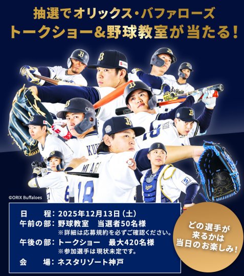 懸賞情報オリックス・バファローズのトークショー&野球教室が当たる豪華LINE懸賞 懸賞名:オリックス・バファローズ トークショー&野球教室当選賞品:オリックス・バファローズ トークショー&野球教室当選人数:50名様応募条件:LINEアカウントで応募企業名:サムティグループ この懸賞に応募する2025年11月21日 17時00分(残り5日) 見逃せない懸賞リポビタンファイン 10本セット50名様新車購入時に使える購入支援 最大30万円合計4,700名様こどもちゃれんじ資料&年齢別体験セット応募者全員カタログギフト / ノンフライヤー / 各地の名産品 / PayPayポイント 100円分10名様 / 50名様 / 70名様 / 8,830名様レコルト 自動調理ポット / レコルト ポットデュオ キャレ / 東ハトお菓子の詰め合わせ100名様 / 100名様 / 800名様豪華賞品(月替り)賞品によって異なります 応募可能な懸賞関連する当選報告 ユースキンミッフィーポンプやサンプルが当たるキャンペーン残り14日月2回開催!豪華賞品が当たる会員限定キャンペーン!毎月2回開催米粉ホットケーキミックス&ルルとララキーホルダーが当たるキャンペーン残り14日【対象店舗限定】岡山備前牛が当たるサッポロビールのクローズドキャンペーン残り5日【東洋水産×ベイシア】クリスマスケーキプレゼントキャンペーン残り9日Wチャンスもアリ!国産ブランド牛肉が当たる豪華ハガキ懸賞残り5日 KIRIN「澄みきり」が当選しました♪SUNTORY「金麦6缶セット」が当選しました!花王「SOFINA iP クロロゲン酸 飲料」の無料モニターに当選しました!Aprica「ブレスエアー クッション」が当選しました!岡三食品のハガキ懸賞で「むき栗アソートセット」が当選しましたDCM×レインボー薬品のハガキ懸賞で「カタログギフト」が当選しました♪ 関連情報: 育児・子育て懸賞オープン懸賞LINE懸賞ネット懸賞豪華・高額懸賞イベント・エンタメSNS懸賞ベビー・キッズ・おもちゃ遊園地・テーマパーク・イベント懸賞情報その他 スポーツ特別な体験|夢の実現育児・子育てタレント・有名人 HOME懸賞情報応募方法SNS懸賞LINE懸賞オリックス・バファローズのトークショー&野球教室が当たる豪華LINE懸賞 2025年11月11日 更新:ものりんず@懸賞主婦【厳選】毎日応募 【全て】毎日応募 クリスマス懸賞 年末年始懸賞