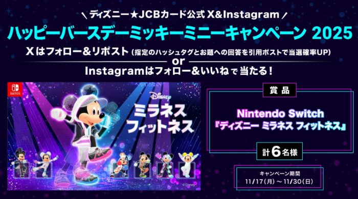 懸賞情報Nintendo Switch『ディズニー ミラネス フィットネス』が当たるSNSキャンペーン 懸賞名:ディズニー★JCBカード公式X&Instagram ハッピーバースデーミッキーミニーキャンペーン 2025当選賞品:Nintendo Switch『ディズニー ミラネス フィットネス』当選人数:6名様応募条件:X(Twitter) または Instagramアカウントで応募企業名:ディズニー★JCBカード この懸賞に応募する2025年11月30日(残り13日) 見逃せない懸賞カルテHD サンプルセット10,000名様ベビー育児グッズ、ギフト券など賞品によって異なります気になっていたあの商品をお得に試せるサイト「サンプル百貨店」ジッパーバッグ / キーホルダー / QUOカード 500円分1,000名様 / 300名様 / 200名様大沢たかおQUOカード / ちょっと贅沢なコーヒー+お取り寄せスイーツ500名様 / 800名様Dyson コードレス掃除機 / 電動アシスト自転車 / combi ベビーカー 他1名様 / 1名様 / 1名様 他 応募可能な懸賞関連する当選報告 サトちゃんグッズがもらえるポイントキャンペーン締切日不明毎月開催♪でん六商品が当たるキャンペーン!定期開催ユニバーサル・エクスプレス・パスが当たる三井住友カード利用キャンペーン残り134日「ズートピア2」のライブビューイング招待券なども当たる豪華X懸賞残り56日スタジオアリス撮影優待券やベビーダノン詰め合わせも当たるクローズドキャンペーン残り13日毎月開催♪河野製紙商品が当たるXキャンペーン!毎月末日 フィール×ニッポンハムのハガキ懸賞で「セ・パ交流戦チケット」が当選しました☆エリエールのTwitter懸賞で「旅行券3万円分」が当選しました☆ポチカム「SK-II自信の美容液『SK-IIステムパワー』サンプルプレゼント」に当選!プリマハムのキャンペーンで「香薫詰め合わせ&Tシャツ」が当選しました!サントリーのクローズド懸賞で「豪華晩酌セット」が当選しました!キユーピー「マヨテラスキユーピー人形」が当選しました☆ 関連情報: ディズニー懸賞X懸賞(Twitter懸賞)オープン懸賞ネット懸賞Instagram懸賞豪華・高額懸賞SNS懸賞ベビー・キッズ・おもちゃ遊園地・テーマパーク・イベント懸賞情報 アニメ・キャラクターゲーム機・ゲームソフトNintendoSwitchDisney|ディズニーJCB任天堂 HOME懸賞情報ジャンル遊園地・テーマパーク・イベントディズニー懸賞Nintendo Switch『ディズニー ミラネス フィットネス』が当たるSNSキャンペーン 2025年11月17日 更新:ものりんず@懸賞主婦【厳選】毎日応募 【全て】毎日応募 クリスマス懸賞 年末年始懸賞