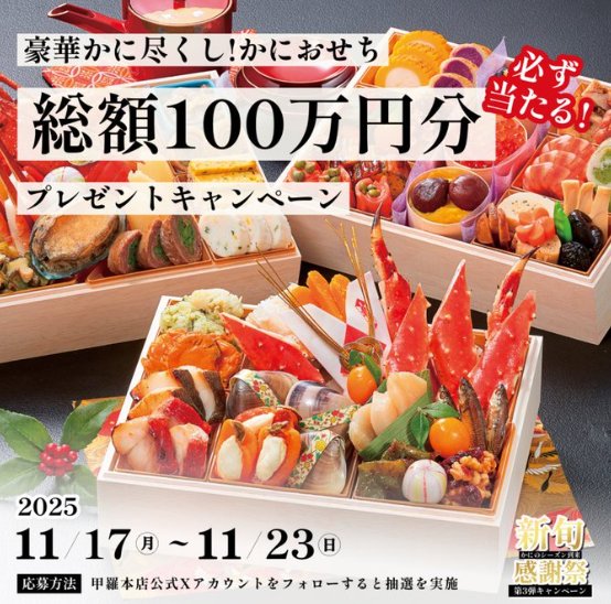 懸賞情報その場で当たる上質なかにをふんだんに使った“特選かにおせち”がその場で当たるX懸賞 懸賞名:かにおせちプレゼントキャンペーン当選賞品:特選かにおせち当選人数:3名様応募条件:X(Twitter)アカウントでその場で当たる企業名:甲羅本店 この懸賞に応募する2025年11月23日(残り6日) 見逃せない懸賞えらべるPay 最大1,000円分 / アサヒスーパードライ ドライクリスタル29,000名様 / 300名様全国の農畜産物や加工品など合計14,100名様防災カタログギフト / Amazonギフトカード 1,000円分5名様 / 100名様町田啓太オリジナルQUOカード / オリジナルエプロン / Amazonギフトコード 500円分毎月50名様 / 毎月50名様 / 毎月1,000名様ディズニーリゾート パークチケット / お菓子詰め合わせ2,500組5,000名様 / 45,000名様現金、カタログギフト、ギフトカードなど(月替り)賞品によって異なります 応募可能な懸賞関連する当選報告 【マックスバリュ東海×メーカー各社】水族館チケット+フェリー乗船券も当たる豪華懸賞残り18日マルシィの横浜アリーナライブチケットなども当たるカラオケDAMの歌唱キャンペーン2026年01月31日(賞品によって異なります)豪華賞品が当たるヤナセの愛車川柳投稿キャンペーン残り22日全プレ☆ベビー用品やぬいぐるみがもらえるママ・プレママさん向けキャンペーン☆締切日不明からしマヨボトルがその場で当たる明星食品の大量当選キャンペーン残り44日1,000名様に最大5,000円分のえらべるPayが当たるクローズド懸賞残り49日 加美乃素本舗「ヘアトリートメント&クイックブローミスト」が当選しました☆ステラシードのTwitter懸賞で「ボタニカルエステ16,500秒分の新習慣セット」が当選しました♪パイロットコーポレーションのTwitter懸賞で「名入れボールペン」が当選しました!ママこえのキャンペーンで「Amazonギフト券1,000円分」が当選しました!新日本スーパー×日清のハガキ懸賞で「どん兵衛食べ比べセット」が当選しました!コーセーのTwitter懸賞で「CT ヒアロチューン マイクロパッチ1年分」が当選しました! 関連情報: X懸賞(Twitter懸賞)オープン懸賞ネット懸賞その場で当たる豪華・高額懸賞SNS懸賞年末年始懸賞食品・飲料懸賞情報 年末年始2025-2026おせち料理食品・グルメ高額賞品・高級品 HOME懸賞情報応募方法SNS懸賞X懸賞(Twitter懸賞)上質なかにをふんだんに使った“特選かにおせち”がその場で当たるX懸賞 2025年11月17日 更新:ものりんず@懸賞主婦【厳選】毎日応募 【全て】毎日応募 クリスマス懸賞 年末年始懸賞
