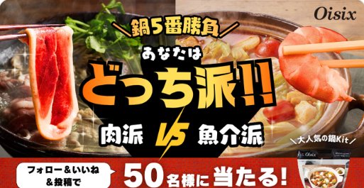 懸賞情報50名様にOisixの鍋Kitが当たる投票キャンペーン 懸賞名:鍋対決5番勝負当選賞品:鍋Kit当選人数:50名様応募条件:X(Twitter)アカウントで毎日応募企業名:Oisix この懸賞に応募する2025年11月21日(残り3日) 見逃せない懸賞SUNTORY × hololive ねぽらぼ限定コラボグッズ合計2,700名様PayPayポイント 1,000円分毎日100名様幼児、小・中・高校生向け通信教育「スマイルゼミ」無料資料希望者全員吉野家 冷凍牛丼の具セット / デジタルポイント 3,000円分600名様 / 600名様北海道じゃがいも+エコバッグ / 北海道じゃがいも+お菓子BOX5万名様 / 5万名様現金、カタログギフト、ギフトカードなど(月替り)賞品によって異なります 応募可能な懸賞関連する当選報告 最大10,000円分のえらべるPayがもらえる日立のお得なキャンペーン残り74日【ヨークベニマル、サンドラッグ、スギ薬局、ダイレックス×モンデリーズ・ジャパン】豪華クローズドキャンペーン残り55日ピジョンの洗える除菌料 ミルクポンW無料サンプルがもらえるキャンペーン!締切日不明自転車や家電、ポイントも当たるWANDAのクローズドキャンペーン!締切日不明最大10,000円分のAmazonギフトカードがその場で当たるXキャンペーン残り1日最大15,000円分のギフトカードが当たるデンタルプロの豪華レシート懸賞残り48日 MaManabi「ジョンソンベビー『我が家のバス育』フォト&シェアコンテスト第1期」イトーヨーカドー×サントリーのハガキ懸賞で「瞬足」が当選しました!日本ハムのハガキ懸賞で「新型PlayStation4本体」が当選しましたー☆ローソンのキャンペーンで「東京ディズニーリゾート35周年クッション」が当選しました!ポチカム「『SK-IIステムパワー』サンプルプレゼントキャンペーン Wチャンス」に当選!Suntory「購入チェーン商品券」が当選しました! 関連情報: X懸賞(Twitter懸賞)オープン懸賞毎日応募ネット懸賞SNS懸賞食品・飲料懸賞情報 食品・グルメ HOME懸賞情報応募方法SNS懸賞X懸賞(Twitter懸賞)50名様にOisixの鍋Kitが当たる投票キャンペーン 2025年11月18日 更新:ものりんず@懸賞主婦【厳選】毎日応募 【全て】毎日応募 クリスマス懸賞 年末年始懸賞