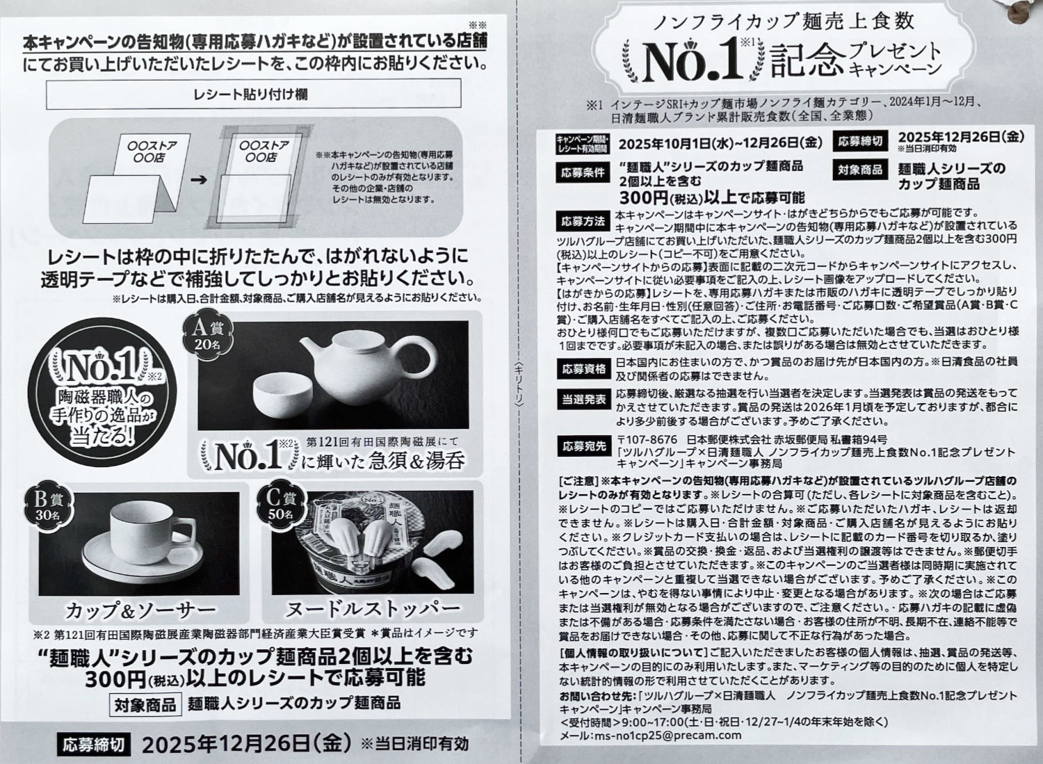 懸賞名:ノンフライカップ麺 売上食数NO.1記念プレゼントキャンペーン