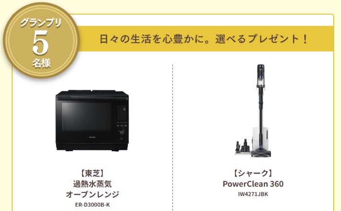 懸賞情報豪華家電や銘柄米食べ比べギフトも当たるセリア de 川柳キャンペーン 懸賞名:セリア de 川柳 2025当選賞品&当選人数:グランプリ:過熱水蒸気 オーブンレンジ or シャーク PowerClean 360(5名様)ノミネート: 銘柄米8種食べ比べギフト(30名様)応募条件:作品を投稿して応募企業名:セリア この懸賞に応募する2025年12月16日(残り19日) 見逃せない懸賞推しの子グッズ1,200名様機動戦士 Gundam GQuuuuuuXコラボグッズ1,000名様デジタルギフト 最大5,000円分合計12名様えらべるPay 1,000円分各回1,000名様デジタルギフト 3,000円分10,000名様子どもにピッタリの教材が見つかる!幼児向け教材をまとめました♪ 応募可能な懸賞関連する当選報告 【近商ストア×明治】クリスマスケーキプレゼントキャンペーン残り4日合計10万名様にお菓子BOXやエコバッグが当たるカルビー大収穫祭キャンペーン2025年12月08日(全10回抽選)お米やジェフグルメカードも当たるクレハのクローズド懸賞残り41日最大10,000円分のデジタルポイントが当たるフローズンアワード2025キャンペーン残り3日福岡ソフトバンクホークスの宮崎キャンプ 選手OBのガイドツアーなどが当たるキャンペーン残り23日シナールエクシアのスキンケアシリーズがサンプルでお試しできるキャンペーン!締切日不明 コーナン&旭化成のハガキ懸賞で「商品券 2,000円分」が当選しました☆マックスバリュ×ヤマザキビスケットのハガキ懸賞で「商品券 2,000円分」が当選しました☆crocos「コカ・コーラ ゼロ プレゼントキャンペーン」サッポロビールのLINE懸賞で「LINEポイント5,000ポイント」が当選しました♪コカ・コーラ「GEORGIA コールドブリュー カフェラテ 1ケース」が当選しました♪P&Gのハガキ懸賞で「P&G商品ギフトセット」が当選しました♪ 関連情報: 親子で応募できるコンテストオープン懸賞ネット懸賞家電・デジタル機器豪華・高額懸賞コンテスト食品・飲料懸賞情報写真投稿・作品投稿 高額賞品・高級品俳句・川柳・標語・作文創作・アイデアお米生活家電調理家電掃除機オーブン・レンジ・トースターTOSHIBA|東芝 HOME懸賞情報応募方法ネット懸賞豪華家電や銘柄米食べ比べギフトも当たるセリア de 川柳キャンペーン 2025年11月27日 更新:ものりんず@懸賞主婦【厳選】毎日応募 【全て】毎日応募 クリスマス懸賞 年末年始懸賞