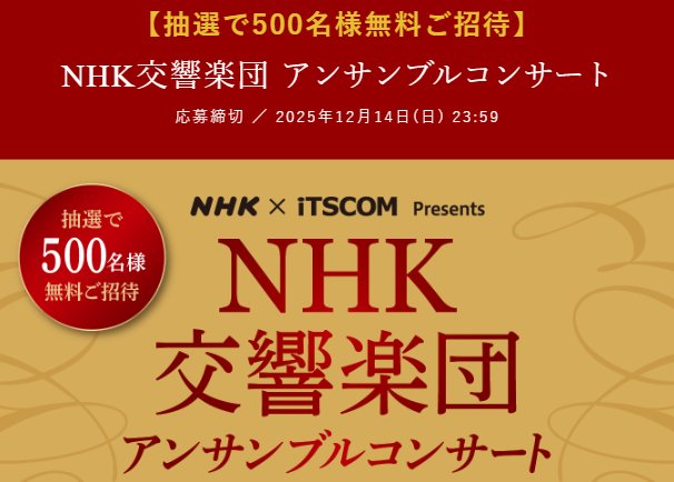 懸賞情報NHK交響楽団アンサンブルコンサートの無料招待券が当たるキャンペーン 懸賞名:【横浜市青葉公会堂】NHK交響楽団アンサンブルコンサート無料ご招待当選賞品:NHK交響楽団アンサンブルコンサート無料招待券当選人数:500名様応募条件:アンケートに答えて応募企業名:イッツコム この懸賞に応募する2025年12月14日(残り9日) 見逃せない懸賞イトメン製品&オリジナルレシピブック各回500名様えらべるPay 500ポイント1,000名様AirPods Pro / ソーダストリーム / 40V型液晶テレビ / Princess テーブルグリル1名様 / 1名様 / 1名様 / 1名様えらべるPay 3,000ポイント分1,500名様きのこ組キーホルダーセット3,000名様バーバパパグッズ / レコルト 自動調理ポット / ベビーキャリア 他対象者全員 / 2名様 / 2名様 他 応募可能な懸賞関連する当選報告 BEAMS DESIGN監修のスペシャルアイテムが当たるクローズドキャンペーン残り20日お好きなことりっぷや旅行券がもらえる写真投稿コンテスト!随時開催アワード受賞商品が合計100名様に当たるグルメアワード投票キャンペーン残り7日えらべるPay1,000円分が当たるぼんち揚購入キャンペーン残り26日マリンフードの商品が毎月当たるキャンペーン!毎月24日アクスタやリロホテルズ&リゾーツ宿泊券が当たる「鬼滅の刃」コラボ懸賞残り14日 THERMOSのハガキ懸賞で「世界の料理シリーズセット」が当選しました!マックスバリュ東海×森永のハガキ懸賞で「瞬足スニーカー」が当選しました!KOSEのTwitter懸賞で「ジュレームヘアケアセット」が当選しました☆ツルハ×クラシエのハガキ懸賞で「クラシエ商品詰め合わせ」が当選しました☆KADOKAWAのキャンペーンで「人気の児童書セット」が当選しました!西友×メーカー各社のハガキ懸賞で「3社商品詰め合わせセット」が当選しました! 関連情報: オープン懸賞ネット懸賞イベント・エンタメチケット・招待券遊園地・テーマパーク・イベント懸賞情報 映像・音楽関東(茨城・栃木・群馬・埼玉・千葉・東京・神奈川)特別な体験|夢の実現招待券・入場券・チケット HOME懸賞情報応募方法ネット懸賞NHK交響楽団アンサンブルコンサートの無料招待券が当たるキャンペーン 2025年11月27日 更新:ものりんず@懸賞主婦【厳選】毎日応募 【全て】毎日応募 クリスマス懸賞 年末年始懸賞