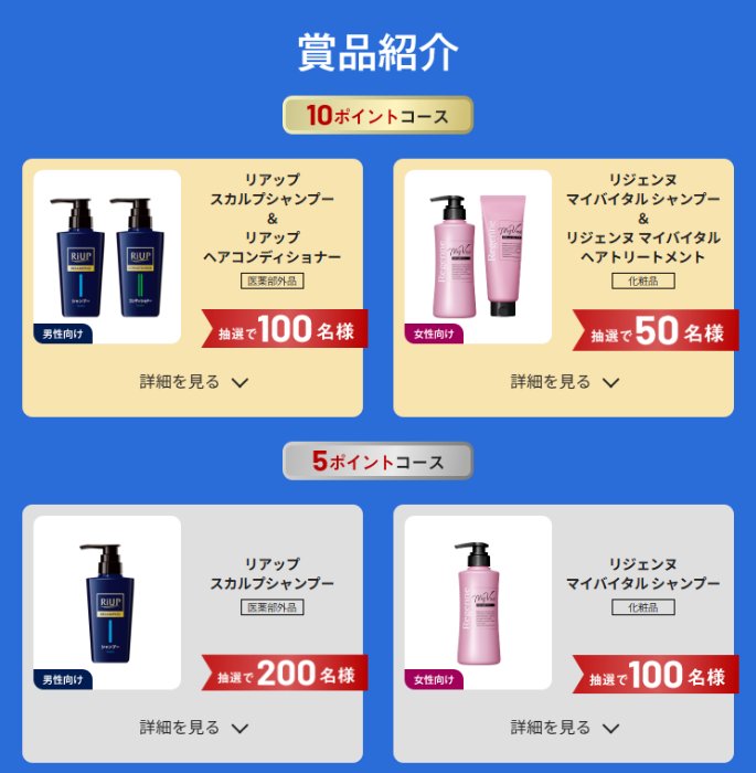 懸賞情報大正製薬のヘアケアが当たる頭髪テストキャンペーン 懸賞名:リアップ プレミアムクラブ ひとりで悩まず、みんなで学ぶ RiUP頭髪の学校 秋の頭髪テスト当選賞品:ヘアケア商品当選人数:450名様応募条件:クイズに答えて応募企業名:大正製薬 この懸賞に応募する2025年12月25日 16時59分(残り13日) 見逃せない懸賞旅行券 5万円分 / デジタルカタログギフト / 白波復刻ボトル / PayPayポイント 500円分3名様 / 70名様 / 1,000名様 / 3,600名様Coke ONドリンクチケット / PayPayポイント 500ポイント / BALMUDA ReBaker 他100,000名様 / 10,000名様 / 50名様 他オルビス無料サンプルセット応募者全員コンビニ無料クーポン 他合計3,000本 他カレ・ド・ショコラ <スペリオリテ>毎月900名様ベルメゾンのおすすめ商品(毎週変動)賞品によって異なります 応募可能な懸賞関連する当選報告 10,000名様にユースキン シソラ おためしセットが当たるキャンペーン2025年12月16日(全3回開催)【おかしのまちおか×ネスレ】ホットプレートやQUOカードが当たるレシート懸賞残り6日レゴランド・ディスカバリー・センターチケットやレゴセットが当たる豪華懸賞残り19日ダリヤ商品の詰め合わせが当たる白髪川柳投稿キャンペーン!毎月開催1,000名様に電子マネー1,000円分が当たるレシートキャンペーン残り50日現金や最大10万ポイントも当たる豪華大量当選キャンペーン☆定期開催 ひかりTVのキャンペーンで「スイーツカタログギフト」が当選しました!富士薬品&ユニ・チャームのハガキ懸賞で「選べる国産和牛カタログギフト」が当選しました!東洋水産のハガキ懸賞で「カタログギフト」が当選しました♪KOSE「ソフティモクレンジングシリーズ売上個数No.1キャンペーン~ソフティモで【すっぴん美人】~」ウエルシア・P&Gのハガキ懸賞で「P&G商品ギフトセット」が当選しました♪P&G「PANTENE トリコン・アンバサダーセット」が当選しました♪ 関連情報: オープン懸賞ネット懸賞美容・健康・コスメ懸賞情報 ヘアケア・ヘアカラー大正製薬 HOME懸賞情報応募方法ネット懸賞大正製薬のヘアケアが当たる頭髪テストキャンペーン 2025年12月02日 更新:ものりんず@懸賞主婦【厳選】毎日応募 【全て】毎日応募 クリスマス懸賞 年末年始懸賞