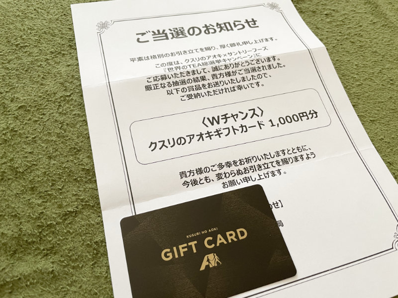 クスリのアオキ×サントリーのキャンペーンで「ギフトカード1,000円分」が当選しました!