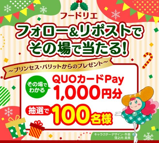 懸賞情報その場で当たるQUOカードPay1,000円分がその場で当たるクリスマスキャンペーン 懸賞名:Xmasキャンペーン当選賞品:QUOカードPay 1,000円分当選人数:100名様応募条件:X(Twitter)アカウントでその場で当たる企業名:フードリエ この懸賞に応募する2025年12月14日(残り11日) 見逃せない懸賞新車購入時に使える購入支援 最大30万円合計4,700名様-196〈レモン〉無料引換えクーポン5万組10万名様Amazonギフトカード 最大5,000円分45名様森永乳業商品クーポン毎月1,000名様勝利の女神:NIKKE × ZONe ENERGYコラボグッズ1,200名様宝塚歌劇 花組 楽天グループ貸切公演チケット1,000組2,000名様 応募可能な懸賞関連する当選報告 【ランドロームジャパン×プリマハム】ディズニーパークチケットやプレートセットが当たるキャンペーン残り2日最大10,000円分のえらべるPayなどがその場で当たるキャンペーン残り4日【定期開催】豪華家電が当たる!ヨドバシカメラ梅田店のX懸賞不定期開催【ファミリーマート】星のカービィグッズやファミマポイントが当たるアプリ限定キャンペーン残り2日毎月2,000名様にデジタルギフトが当たる大量当選クローズド懸賞締切日不明6,000名様にえらべるPayが当たる歯科検診応援キャンペーン2025年12月31日(全6回開催) P&G「myレシピ.com『BRAUN Oral-b モニタープレゼント』」ポチカム【無料モニター募集】新しくなったパンテーンで「あの頃のバージンヘア」へ!マックスバリュ東海×おやつカンパニーのハガキ懸賞で「お菓子詰め合わせ」が当選しました☆コスモス×P&Gのハガキ懸賞で「P&G商品セット」が当選しました!イオン×花王のキャンペーンで「リンベル カタログギフト」が当選しました!富士薬品×メーカー9社のキャンペーンで「カタログギフト」が当選しました! 関連情報: X懸賞(Twitter懸賞)オープン懸賞ネット懸賞その場で当たる現金・金券・ギフト券クリスマス懸賞SNS懸賞懸賞情報 #クリスマスボックス2025記念日・特別な日電子マネー・ポイントQUOカードPayフードリエ HOME懸賞情報応募方法SNS懸賞X懸賞(Twitter懸賞)QUOカードPay1,000円分がその場で当たるクリスマスキャンペーン 2025年12月03日 更新:ものりんず@懸賞主婦【厳選】毎日応募 【全て】毎日応募 クリスマス懸賞 年末年始懸賞