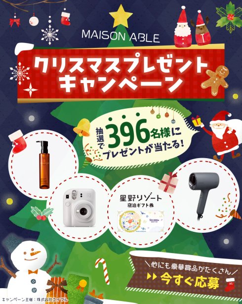 懸賞情報396名様に豪華賞品が当たるエイブルのクリスマスキャンペーン 懸賞名:MAISON ABLE クリスマスプレゼントキャンペーン2025当選賞品&当選人数:星野リゾート宿泊ギフト券 50,000円分(1名様)Panasonic ドライヤー(1名様)富士フィルム チェキ(2名様)などなど賞品多数!応募条件:LINEアカウントで応募企業名:エイブル この懸賞に応募する2025年12月25日(残り21日) 見逃せない懸賞プリキュアグッズ合計9,000名様敏感肌用オールインワンジェル お試し無料モニター応募者全員combi チャイルドシート / Amazonギフトカード 3万円分 / イヤホン 他1名様 / 2名様 / 2名様 他オリエンタルカレーオリジナルグッズ毎月500名様えらべるPay 1,000円分各回1,000名様電動自転車 / ベビーラック / iRobot ルンバ ほか合計1,098名様 応募可能な懸賞関連する当選報告 【東海・北陸・四国 対象店舗限定】豪華海鮮が当たるハガキキャンペーン店舗によって異なります毎日3名様にAmazonギフトカード1,000円分が当たるX懸賞残り2日ANA国内線往復航空券がその場で当たる豪華LINEキャンペーン締切日不明【クスリのアオキ】3万円分のギフトカードやスヌーピーグッズなどが当たるキャンペーン残り60日ミックスフィーディングのお試しセットがもらえるLINEキャンペーン締切日不明最大50,000円の現金 or 電子ギフトがもらえるPanasonicのクローズドキャンペーン残り96日 アピタ・ピアゴ&桃屋のハガキ懸賞で「桃屋瓶詰め3本セット」が当選しました!シンカシング「低反発クッション」が届きました!P&G「myレシピ.com『BRAUN Oral-b モニタープレゼント』」MONIPLA「ユニリーバ CLEAR モニプラキャンペーン」バロー×おやつカンパニーのハガキ懸賞で「オリジナルグッズとお菓子詰め合わせ」が当選しました!丸美屋のハガキ懸賞で「丸美屋商品詰め合わせ」が当たりました☆ 関連情報: オープン懸賞LINE懸賞旅行・宿泊ネット懸賞家電・デジタル機器豪華・高額懸賞現金・金券・ギフト券クリスマス懸賞SNS懸賞無料クーポン・引換券美容・健康・コスメ懸賞情報生活用品・雑貨・家具ファッション・アクセ・貴金属 #クリスマスボックス2025ファッション・衣料品記念日・特別な日キッチングッズ|調理器具スキンケア高額賞品・高級品マウスケア・歯磨き宿泊券・旅行券クーポン・無料券洗顔美容家電カメラドライヤー星野リゾートPanasonic|パナソニック HOME懸賞情報応募方法SNS懸賞LINE懸賞396名様に豪華賞品が当たるエイブルのクリスマスキャンペーン 2025年12月04日 更新:ものりんず@懸賞主婦【厳選】毎日応募 【全て】毎日応募 クリスマス懸賞 年末年始懸賞