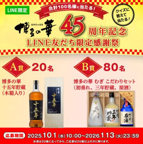 懸賞情報プレミアム商品やオリジナルギフトセットが当たるオエノングループのLINE懸賞 懸賞名:LINE限定 博多の華 45周年記念キャンペーン当選賞品&当選人数:A賞:博多の華 十五年貯蔵[木箱入り](20名様)B賞:博多の華 むぎ こだわりセット(80名様)応募条件:LINEアカウントで応募企業名:オエノングループ この懸賞に応募する2026年01月13日(残り11日) 見逃せない懸賞Coke ONドリンクチケット / PayPayポイント 500ポイント 他100,000名様 / 10,000名様 / 50名様 他星野リゾート宿泊ギフト券 10万円分 / 「君に届け」額装高精細複製原画 / 遊戯王 純金カード 他100名様 / 50名様 / 50名様 他PlayStation 5関連商品15名様ギフトカード 最大15,000円分 / オーラルケアセット合計300名様 / 4,550名様東京ディズニーリゾート・パークチケット / JCBギフトカード 2,000円分100組200名様 / 1,000名様無料で試せる「ベビー用スキンケア」のお得情報♪ 応募可能な懸賞関連する当選報告 Amazonギフトカード最大10,000円分が当たる豪華おみくじキャンペーン残り10日毎月開催♪ユニ・チャーム製品が当たるクイズキャンペーン!定期開催6,000円分のAmazonギフトカードが当たるカラオケDAMの歌唱キャンペーン残り10日【全道アークスグループ×プリマハム】東京ディズニーランド ザ・ダイヤモンドホースシュー 貸切ご招待残り1日全プレ☆電子マネーギフトがかならずもらえるバーコード懸賞!残り363日その場でdポイントが当たる毎日くじキャンペーン♪締切日不明 岡三食品のハガキ懸賞で「むき栗アソートセット」が当選しましたモンデリーズ・ジャパンのハガキ懸賞で「至福のジャム+プレートセット」が当選しました☆UCCのキャンペーンで「オリジナルコーヒーギフト」が当選しました☆@cosme「POLA RED B.A ローション」花王「SOFINA iP クロロゲン酸 飲料」の無料モニターに当選しました!ツルハ×P&Gのクローズド懸賞で「P&G商品セット」が当選しました! 関連情報: オープン懸賞LINE懸賞ネット懸賞SNS懸賞食品・飲料懸賞情報 詰め合わせ・セットドリンク・飲料お酒 HOME懸賞情報応募方法SNS懸賞LINE懸賞プレミアム商品やオリジナルギフトセットが当たるオエノングループのLINE懸賞 2025年12月05日 更新:ものりんず@懸賞主婦【厳選】毎日応募 【全て】毎日応募 年末年始懸賞