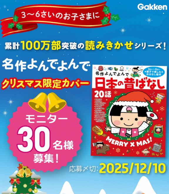 懸賞情報商品モニター3~6歳向けの読み聞かせ本がお試しできる商品モニターキャンペーン キャンペーン名:累計100万部の読み聞かせ本「名作よんでよんで」シリーズ モニター計30名様募集!当選賞品:読み聞かせ本 商品モニター当選人数:30名様応募条件:X(Twitter) または Instagramアカウントで応募企業名:学研コメント:※対象商品到着後、2週間以内に実際に商品をお使いいただき、ご自身のSNSに「本書を使用している画像や動画」「本書を使った感想」「表紙やお気に入りのページの写真」などを投稿していただける方 など条件あり この懸賞に応募する(応募期間終了)2025年12月10日今すぐ応募可能な懸賞はコチラから 見逃せない懸賞デジタルギフト 1,000円分 / クレヨンしんちゃんグッズ1,000名様 / 各回200名様Amazonギフトカード 最大10,000円分毎月1,000名様母子手帳ケース / しかけ絵本 / Amazonギフト券 5,000円分 他応募者全員 / 応募者全員 / 毎月10名様 他機動戦士 Gundam GQuuuuuuXコラボグッズ1,000名様デジタルスターバックスカード、特別なプレゼント など賞品によって異なります宝塚歌劇 花組 楽天グループ貸切公演チケット1,000組2,000名様 応募可能な懸賞関連する当選報告 最大20,000円分のAmazonギフトが100名様に当たるXキャンペーン残り5日葬送のフリーレングッズやえらべるPayなどが当たるアサヒ飲料の自販機限定キャンペーン2026年03月31日(全2回開催)QUOカードPayがその場で当たる「0」のつく日限定Xキャンペーン毎月0のつく日に開催【森永製菓×京王ストア】木下大サーカス立川公演チケットプレゼントキャンペーン残り11日ディズニーシースペシャルナイト招待&宿泊券も当たるUCCの豪華懸賞残り35日渡辺直美 東京ドーム公演での歌唱映像放映やチケットも当たるカラオケDAMの豪華懸賞残り32日 UCC「『2015 COFFEE DREAM キャンペーン』バロー・バローホームセンター・食鮮館タイヨー」日本スポーツ振興センターのキャンペーンで「QUOカード 1,000円分」が当選しました♪コノミヤのクローズド懸賞で「酒類詰め合わせセット」が当選しました!ミサワホーム「いい住まい研究プロジェクトアンケート」花王「SOFINA iP クロロゲン酸 飲料」の無料モニターに当選しました!ビバホーム×伊藤園のハガキ懸賞で「みかん食べ比べセット」が当選しました! 関連情報: X懸賞(Twitter懸賞)育児・子育て懸賞オープン懸賞ネット懸賞Instagram懸賞SNS懸賞商品モニターベビー・キッズ・おもちゃ懸賞情報文具・書籍・映像 本・電子書籍・マンガ限定条件あり懸賞育児・子育て学研|Gakken HOME懸賞情報応募方法SNS懸賞X懸賞(Twitter懸賞)3~6歳向けの読み聞かせ本がお試しできる商品モニターキャンペーン 2025年12月08日 更新:ものりんず@懸賞主婦【厳選】毎日応募 【全て】毎日応募 クリスマス懸賞 年末年始懸賞