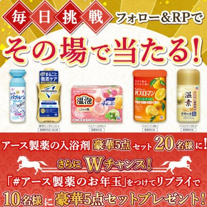 懸賞情報その場で当たるアース製薬の詰め合わせセットが当たるお年玉キャンペーン 懸賞名:お年玉キャンペーン当選賞品:アース製薬詰め合わせセット当選人数:20名様応募条件:X(Twitter)アカウントで毎日その場で当たる企業名:アース製薬 この懸賞に応募する(応募期間終了)2026年01月07日今すぐ応募可能な懸賞はコチラから 見逃せない懸賞テンスター カラーシャンプー無料サンプル対象者全員オリジナル丼ぶり / あおもり倉石牛 / giftee Box 1,000円分400名様 / 100名様 / 500名様JTBトラベルギフト 35,000円分20名様プリキュアグッズ合計9,000名様新リキッドファンデ サンプル5万名様オルビス無料サンプルセット応募者全員 応募可能な懸賞関連する当選報告 応募者全員に「おなまえシール」がもらえるベネッセのキャンペーン残り45日スタジオアリス撮影無料券も当たるママ向けキャンペーン♪残り1日毎月抽選で豪華賞品が当たる、一条工務店の毎月プレゼントキャンペーン毎月開催敏感肌用オールインワンジェルの無料モニター締切日不明毎月抽選!縁起ものキョロちゃんが当たる森永のレシートキャンペーン残り199日選りすぐりの絵本が当たる会員限定キャンペーン☆随時開催 KOSEのTwitter懸賞で「ジュレームアミノ セット」が当選しました☆プリマハムのハガキ懸賞で「ディズニーランド 貸切チケット」が当選しました☆不二家「LOOK Carre 公式アンバサダー」に認定されました☆オークワ×森永のハガキ懸賞で「森永製菓詰め合わせ」が当選しました♪ユニ・チャームのキャンペーンで「ムーニーエアフィット 1パック」が当選しました!フィール&寿がきやのハガキ懸賞で「寿がきや謹製こだわりチャーシュー」が当選しました☆ 関連情報: X懸賞(Twitter懸賞)オープン懸賞毎日応募その場で当たるネット懸賞SNS懸賞年末年始懸賞美容・健康・コスメ懸賞情報生活用品・雑貨・家具 年末年始2025-2026詰め合わせ・セットマウスケア・歯磨き入浴剤・ボディソープアース製薬 HOME懸賞情報応募方法SNS懸賞X懸賞(Twitter懸賞)アース製薬の詰め合わせセットが当たるお年玉キャンペーン 2026年01月02日 更新:ものりんず@懸賞主婦【厳選】毎日応募 【全て】毎日応募 年末年始懸賞