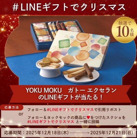 懸賞情報ヨックモックのガトーエクセラン引換券が当たるXキャンペーン 懸賞名:LINEギフトでクリスマス当選賞品:ガトーエクセラン引換券当選人数:10名様応募条件:X(Twitter)アカウントで毎日応募企業名:ヨックモック この懸賞に応募する2025年12月21日(残り2日) 見逃せない懸賞ドラゴンクエスト 職業Tシャツ / ギフトペイ 10円1,500名様 / 98,500名様からしマヨボトル10,000名様オルビス無料サンプルセット応募者全員プリキュアグッズ合計9,000名様イトメン製品&オリジナルレシピブック各回500名様宝塚歌劇 花組 楽天グループ貸切公演チケット1,000組2,000名様 応募可能な懸賞関連する当選報告 毎月50名様にQUOカードが当たる会員限定キャンペーン♪毎月開催現金や最大10万ポイントも当たる豪華大量当選キャンペーン☆定期開催最大1,000ポイント分のLINEポイントがその場で当たるキャンペーン!締切日不明便利家電やポップアップテントなども当たる豪華キャンペーン!毎月末日最大3万円分の現金 or 電子ギフトがもらえるPanasonicのお得なキャンペーン残り45日東横インの宿泊割引券&キッザニアお菓子セットが当たるXキャンペーン残り26日 AEON SQUARE「ヘルシア モルトスタイル」が当選しました!babycoのキャンペーンで「あかちゃんの育脳クラシックえほん」が当選しました♪オハヨー乳業のLINE懸賞で「バルミューダ ザ・トースター」が当選しました!DCMホールディングス&マンダムのハガキ懸賞で「ギフトカード 5,000円分」が当選しました☆P&G「myレシピ.com『SK-II 体験キット30,000名モニタープレゼント』」ロート製薬「シャンプー&コンディショナー モニター」に当選しました☆ 関連情報: X懸賞(Twitter懸賞)オープン懸賞毎日応募ネット懸賞クリスマス懸賞SNS懸賞無料クーポン・引換券懸賞情報 #クリスマスボックス2025記念日・特別な日クーポン・無料券 HOME懸賞情報応募方法SNS懸賞X懸賞(Twitter懸賞)ヨックモックのガトーエクセラン引換券が当たるXキャンペーン 2025年12月18日 更新:ものりんず@懸賞主婦【厳選】毎日応募 【全て】毎日応募 クリスマス懸賞 年末年始懸賞
