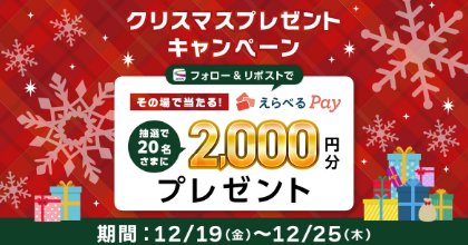 懸賞情報その場で当たるえらべるPay2,000円分がその場で当たるクリスマスキャンペーン 懸賞名:クリスマス特別企画当選賞品:えらべるPay 2,000円分当選人数:20名様応募条件:X(Twitter)アカウントでその場で当たる企業名:iAEON この懸賞に応募する2025年12月25日(残り6日) 見逃せない懸賞Amazonギフトカード 500円分2,000名様PayPayポイント 1,000ポイント / QUOカード 2,000円分+カードケース / タンブラー12,500名様 / 3,500名様 / 1,400名様【無料体験可能】子ども向け「習い事・プログラミング教室」JTBトラベルギフト 10万円分 / ビスケット詰め合わせ28名様 / 2,280名様デジタルスターバックスカード、特別なプレゼント など賞品によって異なりますJTB カタログギフト1名様 応募可能な懸賞関連する当選報告 毎月抽選!変なホテルの無料宿泊券が当たるメルマガ登録キャンペーン毎月抽選【実体験】妊娠中の懸賞は当選しやすい!妊婦さんにオススメの懸賞活動☆残り355758日定期開催☆図書カードネットギフトが当たるクイズキャンペーン!定期開催5万円分の星野リゾート宿泊ギフトが当たる豪華キャンペーン残り12日【定期開催】豪華家電が当たる!ヨドバシカメラ梅田店のX懸賞不定期開催旅行券やヘアドライヤーも当たる花王の豪華クローズドキャンペーン(本日最終日!!) マックスバリュ中部×東洋水産のハガキ懸賞で「商品券 3,000円分」が当選しました!リビコミュ「【Let’s Enjoy!! Oh洗濯】サークルプレゼント」Boome「ギフト券2,000円分を100名様にプレゼント!!」DyDoのハガキ懸賞で「ル・クルーゼ ペア・ショート・タンブラー」が当選しました!buzzLife「奇跡!?の198kcalを体験 第2弾(日清食品)プロジェクト」に参加決定!JA全農のキャンペーンで「お米1俵」が当選しましたー! 関連情報: X懸賞(Twitter懸賞)オープン懸賞ネット懸賞その場で当たる現金・金券・ギフト券クリスマス懸賞SNS懸賞懸賞情報 #クリスマスボックス2025記念日・特別な日電子マネー・ポイントAEON|イオン HOME懸賞情報応募方法SNS懸賞X懸賞(Twitter懸賞)えらべるPay2,000円分がその場で当たるクリスマスキャンペーン 2025年12月19日 更新:ものりんず@懸賞主婦【厳選】毎日応募 【全て】毎日応募 クリスマス懸賞 年末年始懸賞