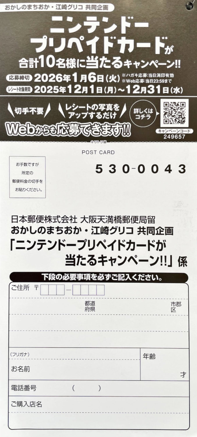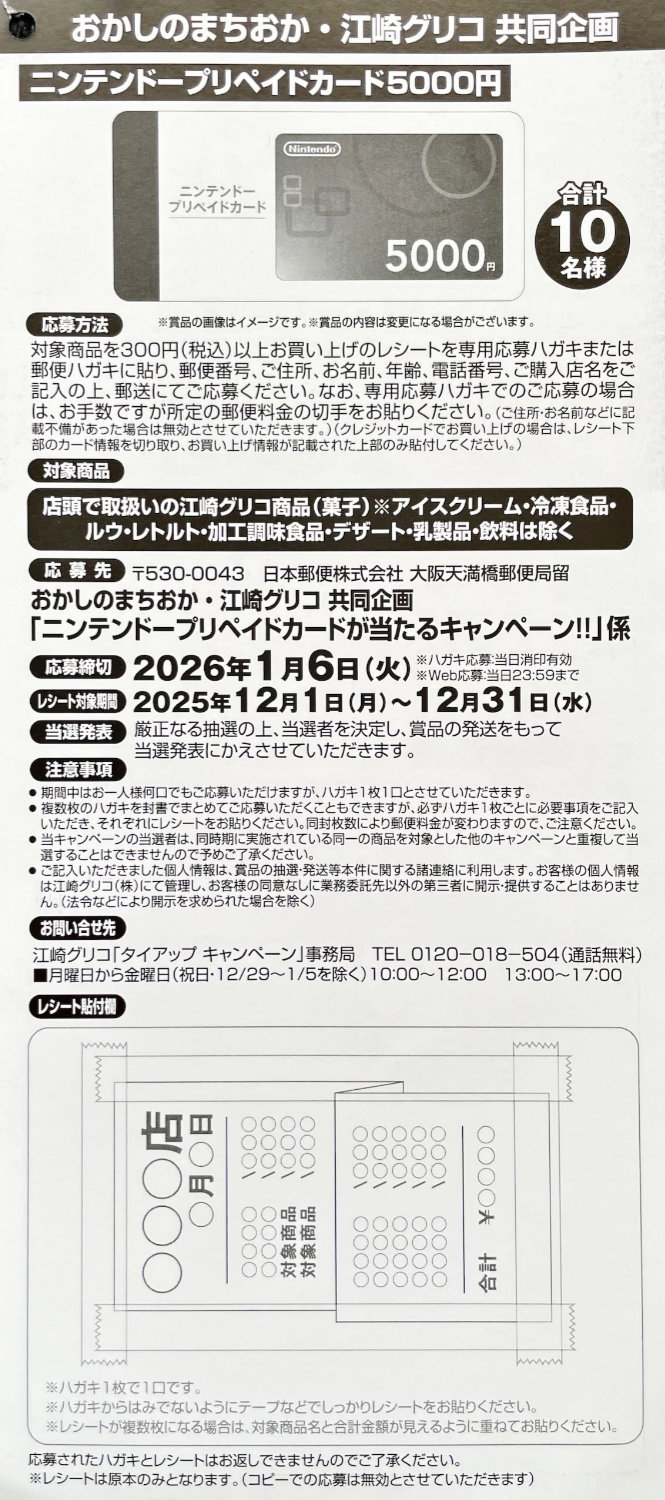 【おかしのまちおか×グリコ】ニンテンドープリペイドカードが当たるレシート懸賞