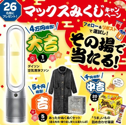懸賞情報その場で当たるDysonの空気清浄ファンやあったかセットも当たる豪華キャンペーン 懸賞名:マックスみくじキャンペーン当選賞品&当選人数:Dyson 空気清浄ファン(5名様)着る毛布&湯たんぽ(5名様)食品セット(20名様)応募条件:X(Twitter)アカウントで毎日その場で当たる企業名:ミスターマックス この懸賞に応募する2026年01月05日(残り3日) 見逃せない懸賞Oisix野菜+ケンミン焼ビーフン各回250名様丸善ジュンク堂書店専用QUOカードPay 最大30,000円分1,000名様はじめてのベビースタイ応募者全員えらべるPay 最大1,000ポイント分1,600名様JCBギフトカード 20,000円分 / えらべるPay 10,000円分 他10名様 / 10名様 他パンパース オムツ毎月1名様 応募可能な懸賞関連する当選報告 すみっコぐらしグッズやQUOカードPayが当たるミツカンのクローズド懸賞残り7日宿泊券やQUOカードなども当たるJALグループ機内誌「SKYWARD」のアンケート懸賞残り3日【マークスHD×メーカー各社】トイ・ストーリーホテル宿泊券&パークチケットも当たる豪華懸賞残り30日Wチャンスもアリ!10万円分のJTBトラベルギフトが当たる全国ビスケット協会の豪華懸賞残り66日2万円分のギフト券やむき栗アソートセットも当たるハガキキャンペーン年3回抽選PayPayポイント3,000円分が当たる森永乳業のクローズドキャンペーン残り28日 マックスバリュ×モンスターエナジーのハガキ懸賞で「パーカー」が当選しました♪カゴメのLINE懸賞で「カゴメ健康飲料セット」が当選しました♪イトーヨーカドー×サントリーのハガキ懸賞で「瞬足」が当選しました!PLANT×キリンのキャンペーンで「紅ずわいがに3杯」が当選しました!LOCATION JAPAN「2月号プレゼント企画」加美乃素本舗「ヘアトリートメント&クイックブローミスト」が当選しました☆ 関連情報: X懸賞(Twitter懸賞)オープン懸賞毎日応募その場で当たるネット懸賞家電・デジタル機器豪華・高額懸賞年末年始懸賞SNS懸賞食品・飲料懸賞情報生活用品・雑貨・家具ファッション・アクセ・貴金属 年末年始2025-2026ファッション・衣料品詰め合わせ・セットお菓子・スイーツ・デザート生活家電加湿器・除湿機・清浄機dyson|ダイソン HOME懸賞情報応募方法SNS懸賞X懸賞(Twitter懸賞)Dysonの空気清浄ファンやあったかセットも当たる豪華キャンペーン 2026年01月02日 更新:ものりんず@懸賞主婦【厳選】毎日応募 【全て】毎日応募 年末年始懸賞