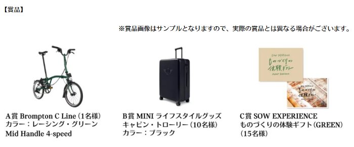 懸賞情報折りたたみ自転車やスーツケースなどが当たるMINIの豪華キャンペーン 懸賞名:MINIから新年を彩る嬉しいプレゼントキャンペーン。当選賞品&当選人数:A賞:折りたたみ自転車(1名様)B賞:スーツケース(10名様)C賞:カタログギフト(15名様)応募条件:アンケートに答えて応募企業名:MINI Japan この懸賞に応募する2026年01月22日(残り9日) 見逃せない懸賞JCBギフトカード 20,000円分 / えらべるPay 10,000円分 他10名様 / 10名様 他USJ ハロウィーン初日貸切招待券 / スタジオ・パス4,750組12,000名様 / 1,000組2,000名様はじめてのベビースタイ応募者全員JTBトラベルギフト 10万円分 / SOFINA iP スキンケアアイテム 4点セット / giftee Cafe Box 3,000円分10名様 / 100名様 / 1,000名様クスリのアオキギフトカード 3万円分 / スヌーピーグッズ300名様 / 合計7,000名様サイベックス ミオス ベビーカー / 洗えるベビー布団セット / パナソニック 電動自転車 他1名様 / 3名様 / 1名様 他 応募可能な懸賞関連する当選報告 全プレもアリ☆ベビー&育児用品も当たるポイントキャンペーン!毎月抽選お米やご飯のお供が97名様に当たるプレゼントキャンペーン残り19日ONE PIECEのアクスタが当たるジョイフルのレシートキャンペーン2026年01月13日15:00(全2回開催)JA全農ふくれんの野菜や果物などが当たるアンケートキャンペーン毎月開催ソニー・ピクチャーズ コラボ オリジナルムービーTシャツが当たる大量当選懸賞残り43日森永 ピノのオリジナルグッズが当たるピノノくじキャンペーン2026年03月25日(全2回開催) エバラ食品のハガキ懸賞で「黄金トング」が当選しました♪第2広報室「MAYBELLINE NEW YORK スーパー ミネラル コンシーラー ロングキープ」紀文食品「家族の絆を深めよう プレゼントキャンペーン」イオン×キリンのハガキ懸賞で「午後の紅茶&カレー3種」が当選しました!アサヒビールのLINE懸賞で「JCBプレモデジタル5,000円」が当選しました!ヤクルトのハガキ懸賞で「ラグナシア ペアパスポート」が当選しました! 関連情報: 車・バイク・自転車オープン懸賞ネット懸賞豪華・高額懸賞現金・金券・ギフト券懸賞情報 高額賞品・高級品高級ブランド自転車・電動自転車カタログギフトMINI HOME懸賞情報応募方法ネット懸賞折りたたみ自転車やスーツケースなどが当たるMINIの豪華キャンペーン 2026年01月13日 更新:ものりんず@懸賞主婦【厳選】毎日応募 【全て】毎日応募 年末年始懸賞