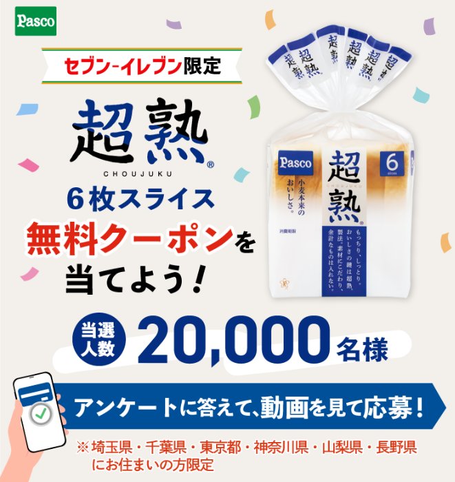 懸賞情報その場で当たる【地域限定】超熟 6枚スライスの無料引換クーポンが当たるLINEキャンペーン 懸賞名:セブン‐イレブン限定 「超熟 6枚スライス」無料クーポンを当てよう!当選賞品:超熟 6枚スライス 無料クーポン当選人数:20,000名様応募条件:LINEアカウントで応募企業名:Pasco この懸賞に応募する2026年01月19日 09時59分(残り4日) 見逃せない懸賞夜用白玉タイトニングマスク商品モニター2,000名様アウトドアパーカー / ポケット付きTシャツ / Coke ON ドリンクチケット600名様 / 500名様 / 3万名様宝塚歌劇 花組 楽天グループ貸切公演チケット1,000組2,000名様旅行券 10万円分 / プライドポテト 1年分 / 湖池屋商品 40袋3名様 / 150名様 / 1,110名様BRUNO コンパクトホットプレート / dancyu グルメギフトカタログ 他20名様 / 40名様 他Disneyのおしりふき毎月1名様 応募可能な懸賞関連する当選報告 JCBギフトカード10,000円分が当たるプロスタッフのクイズ懸賞2026年03月31日(全2回開催)全プレ☆QUOカードor図書カードが必ずもらえるキャンペーン!締切日不明広瀬アリスオリジナルデザインQUOカードやエアリッスBOXが当たる大量当選懸賞残り45日【定期開催】豪華家電が当たる!ヤマダデンキのX懸賞♪随時開催毎月2,000名様にデジタルギフトが当たる大量当選クローズド懸賞締切日不明インウイのベースメイクがサンプルでお試しできるキャンペーン残り2日 J:COM「魔女の宅急便 映画劇場鑑賞券」が当選しました!KOSE「アスタブランのサンプルセット」が当選しました☆ココカラファイン×中部薬品×カルビー×サントリーのハガキ懸賞で「浜松餃子」が当選しました☆平和堂×伊藤ハムのハガキ懸賞で「USJ ユニバーサル・パーティー ~ザ・サウンド~招待券」が当選しました!アヲハタのキャンペーンで「みかん&ぶどうジュース」が当選しました♪象印のキャンペーンで「自由軒カレー」が当選しました☆ 関連情報: オープン懸賞毎日応募LINE懸賞ネット懸賞その場で当たる大量当選無料クーポン・引換券SNS懸賞狙い目・穴場懸賞懸賞情報 クーポン・無料券パスコ|Pascoセブンイレブン HOME懸賞情報応募方法SNS懸賞LINE懸賞【地域限定】超熟 6枚スライスの無料引換クーポンが当たるLINEキャンペーン 2026年01月14日 更新:ものりんず@懸賞主婦【厳選】毎日応募 【全て】毎日応募 年末年始懸賞