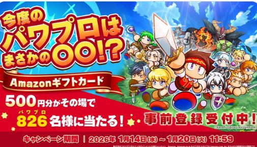 懸賞情報その場で当たる500円分のAmazonギフトカードが826名様にその場で当たるXキャンペーン 懸賞名:今度のパワプロはまさかの○○!?キャンペーン当選賞品:Amazonギフトカード 500円分当選人数:826名様応募条件:X(Twitter)アカウントで毎日その場で当たる企業名:パワアド この懸賞に応募する2026年01月20日 11時59分(残り5日) 見逃せない懸賞 Number_i メッセージカード付き雪肌精 SNOWポーチ / 雪肌精スキンケアセット3,000名様 / 500名様今田美桜直筆サイン入りウイスキー 陸 / 限定タンブラー+ウイスキー 陸 / QUOカード 500円分10名様 / 500名様 / 500名様JTB カタログギフト1名様純金 海老天 / ホワイトホース卓上ホットショーケース / あっとギフト 500円分1名様 / 5名様 / 2,020名様えらべるPay 最大1,000円分毎日50名様Dyson コードレス掃除機 / 電動アシスト自転車 / combi ベビーカー 他1名様 / 1名様 / 1名様 他 応募可能な懸賞関連する当選報告 お好きなことりっぷや旅行券がもらえる写真投稿コンテスト!随時開催アスタリフトBBクリーム無料サンプルセットがお得に試せる!締切日不明ベビー・育児用品が当たる豪華ママ・パパ・プレママ限定キャンペーン残り34日特産品や巨人グッズなどが当たる、読売新聞のプレゼントキャンペーン!定期開催宿泊券や映画試写会なども当たるアンケート懸賞♪賞品によって異なりますポイントで三菱電機製品や豪華賞品が当たるキャンペーン!定期開催 リードオフジャパンのTwitter懸賞で「アップルタイザー さくらデザインボトル・シャンパングラスセット」が当選しました☆KIRIN「星のカービィ ロボボプラネット」が当選しました♪ヤマナカ×伊藤ハムのハガキ懸賞で「伊藤ハム商品詰め合わせ」が当選しました!KOSEのTwitter懸賞で「ジュレームアミノ セット」が当選しました☆ノートンのTwitter懸賞で「等身大ドラえもんバスタオル」が当選しました!日清冷凍食品のネットクローズド懸賞で「Amazonギフト券10,000円分」が当選しました! 関連情報: X懸賞(Twitter懸賞)オープン懸賞毎日応募その場で当たるネット懸賞現金・金券・ギフト券SNS懸賞懸賞情報 Amazonギフト券商品券・ギフト券・金券 HOME懸賞情報応募方法SNS懸賞X懸賞(Twitter懸賞)500円分のAmazonギフトカードが826名様にその場で当たるXキャンペーン 2026年01月15日 更新:ものりんず@懸賞主婦【厳選】毎日応募 【全て】毎日応募 年末年始懸賞